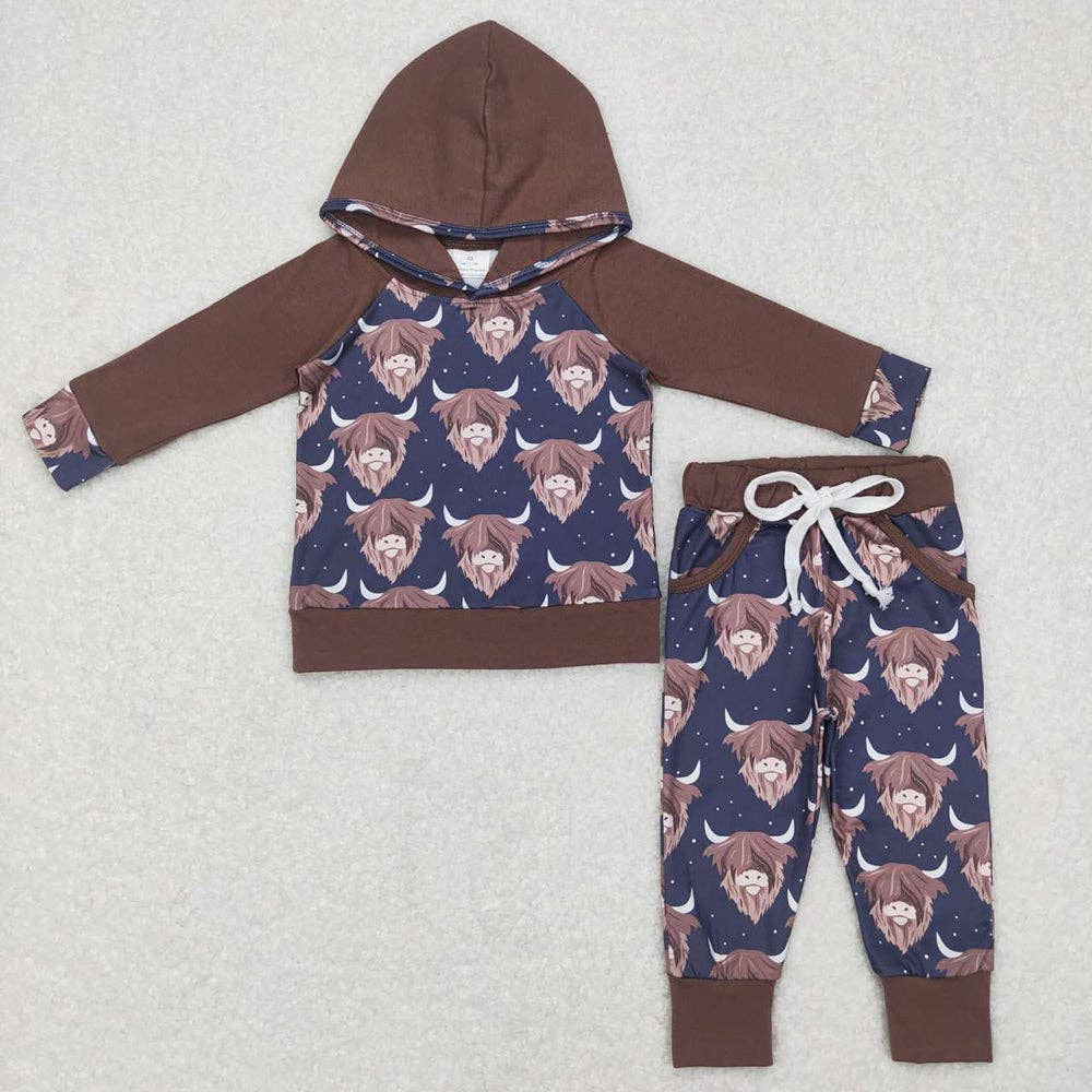 Baby Boys Long Sleeve Hooded Highland Cow Tops Pants Clothes