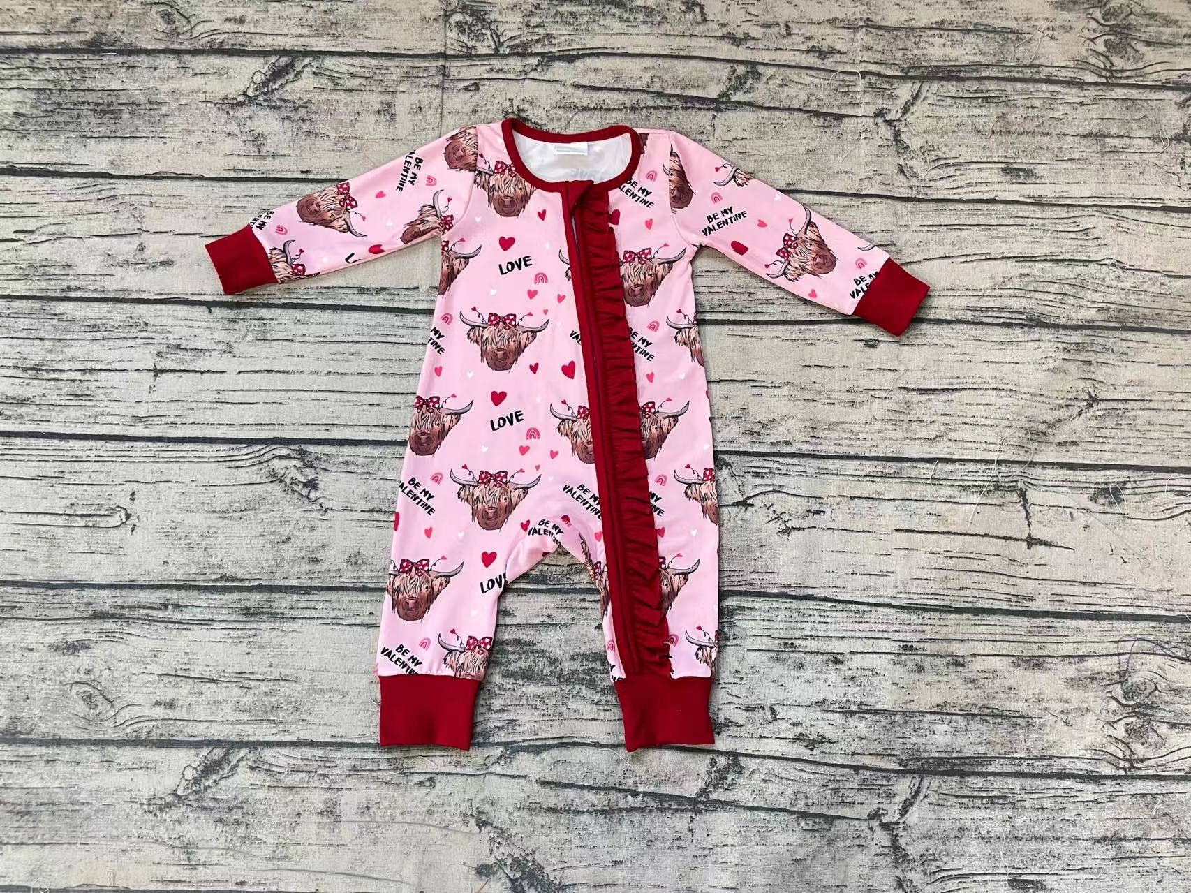 Baby Girls Western Highland Cow Valentines Hearts Zip Romper