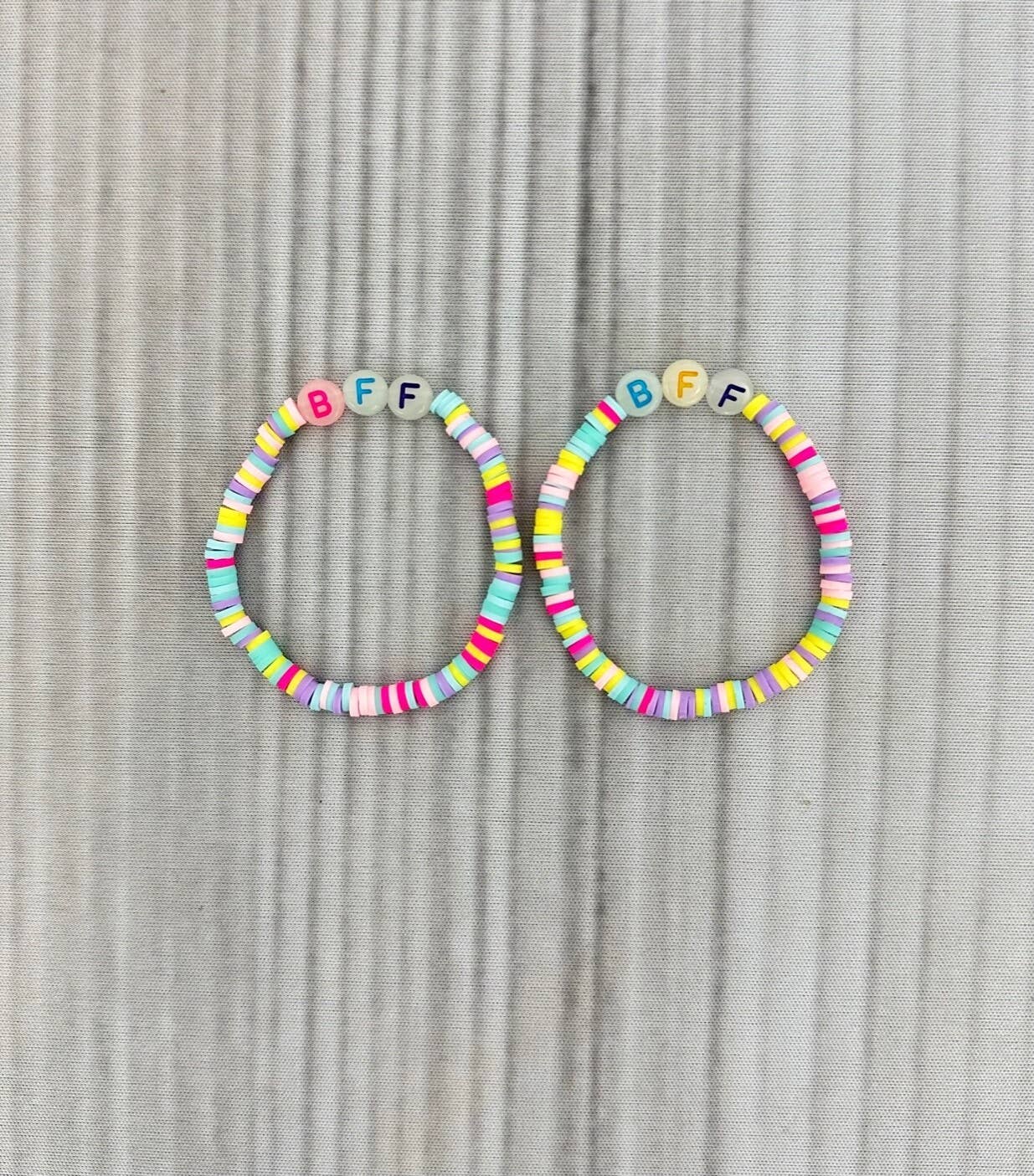 A set of BFF personalized stretch heishi disc bracelets made on stretchy string. Comes as a pair of bracelets! Child-...
