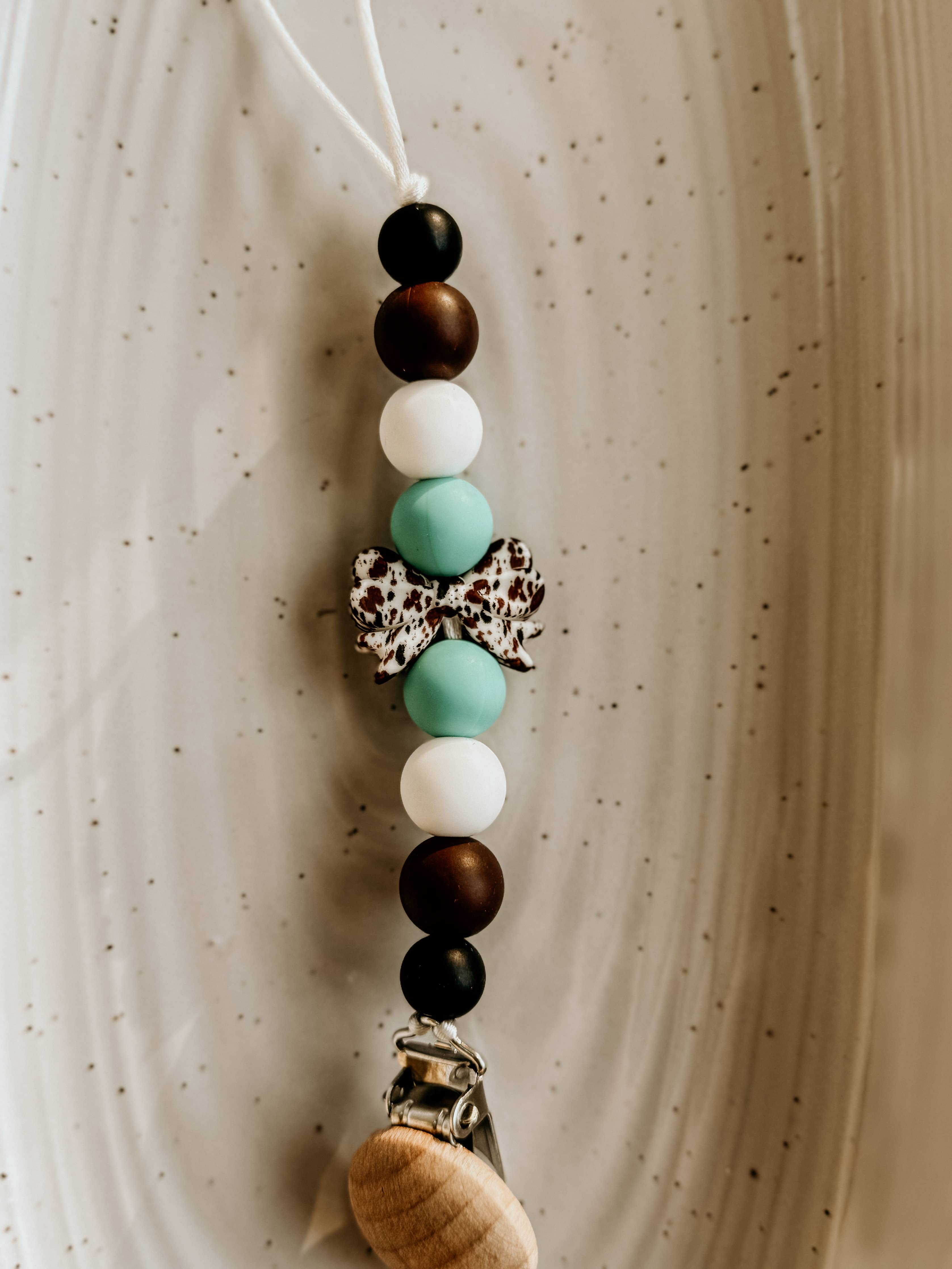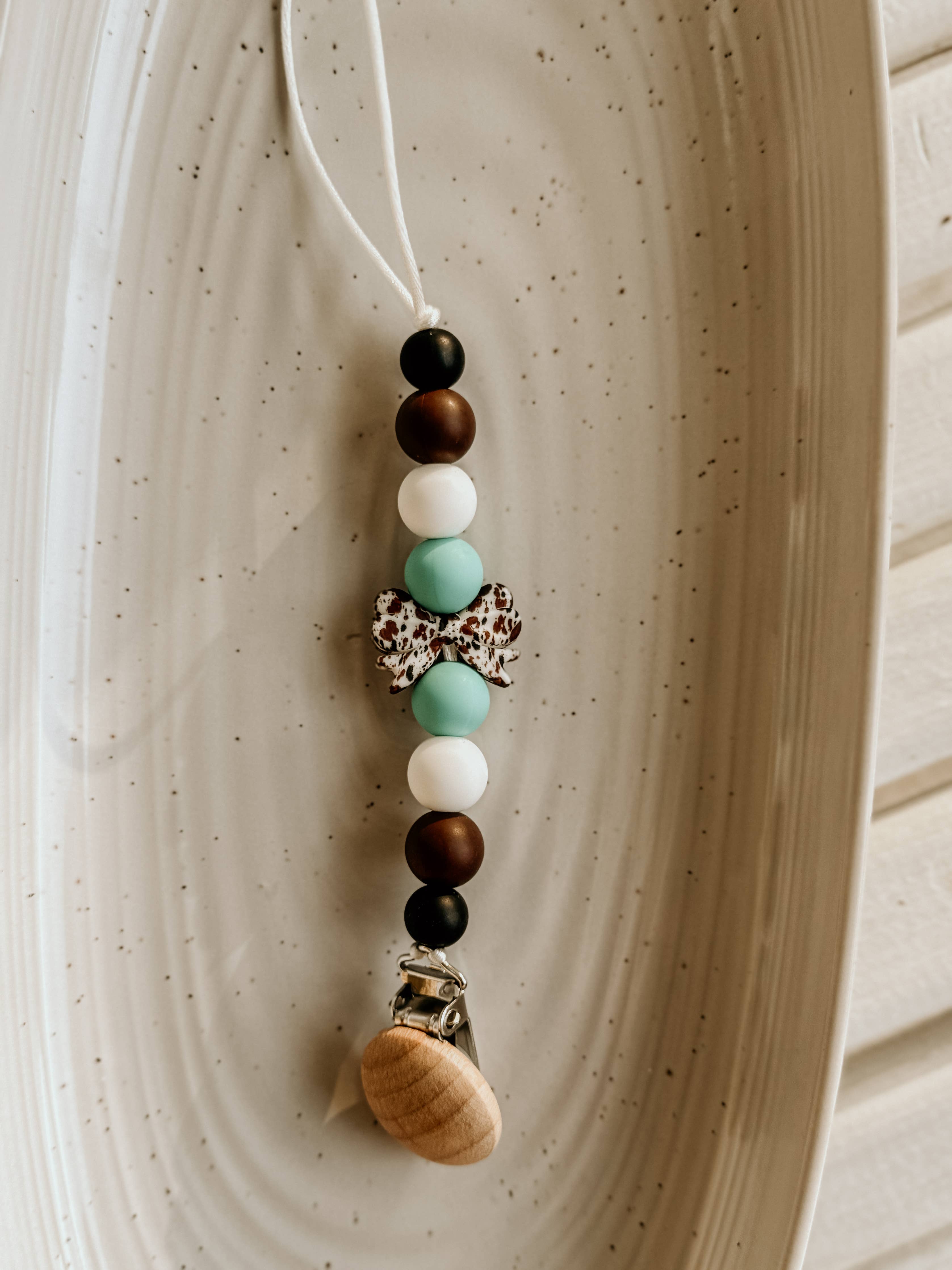 The cutest little cow print bow pacifier holder Western Pacifier Clip Silicone beads Wooden clip