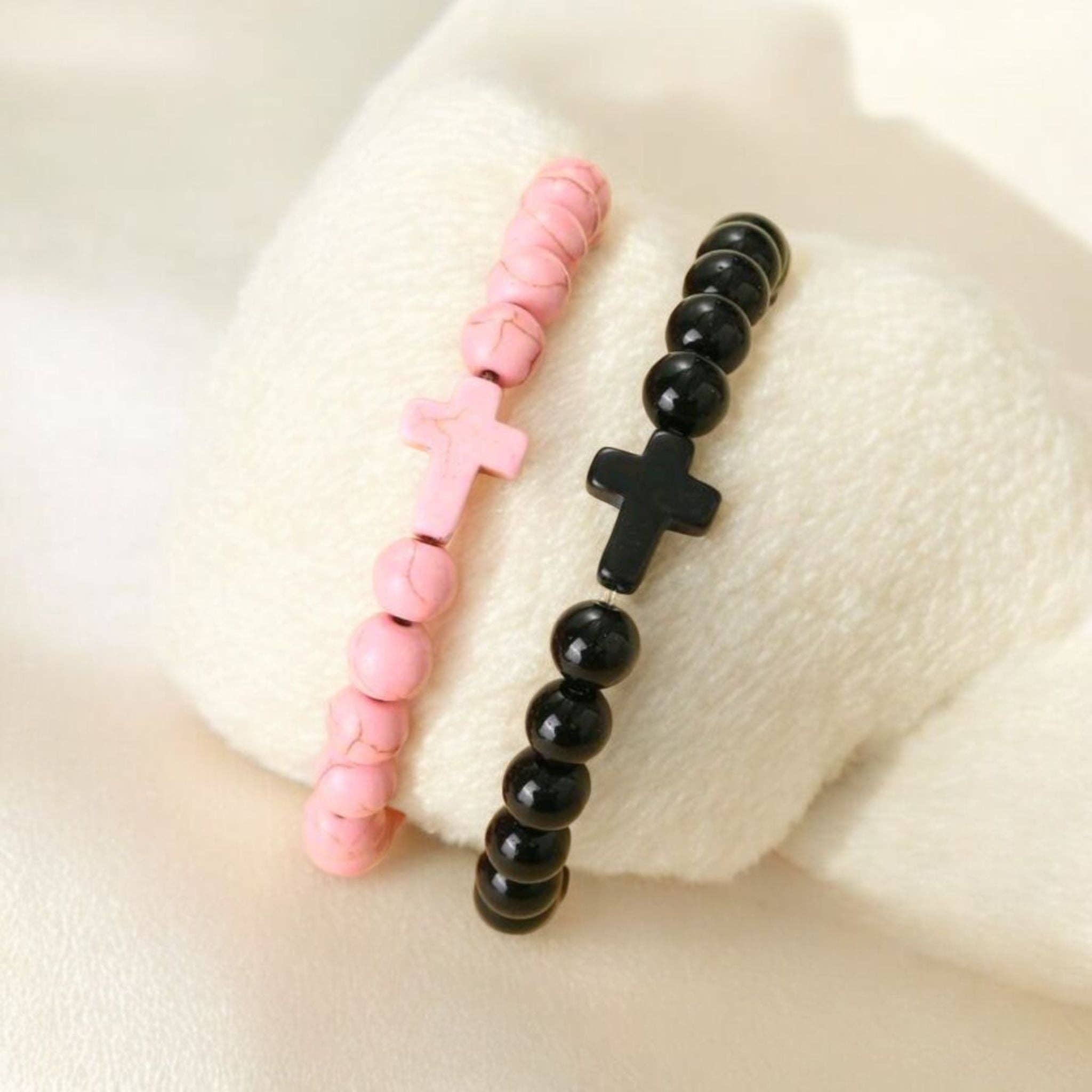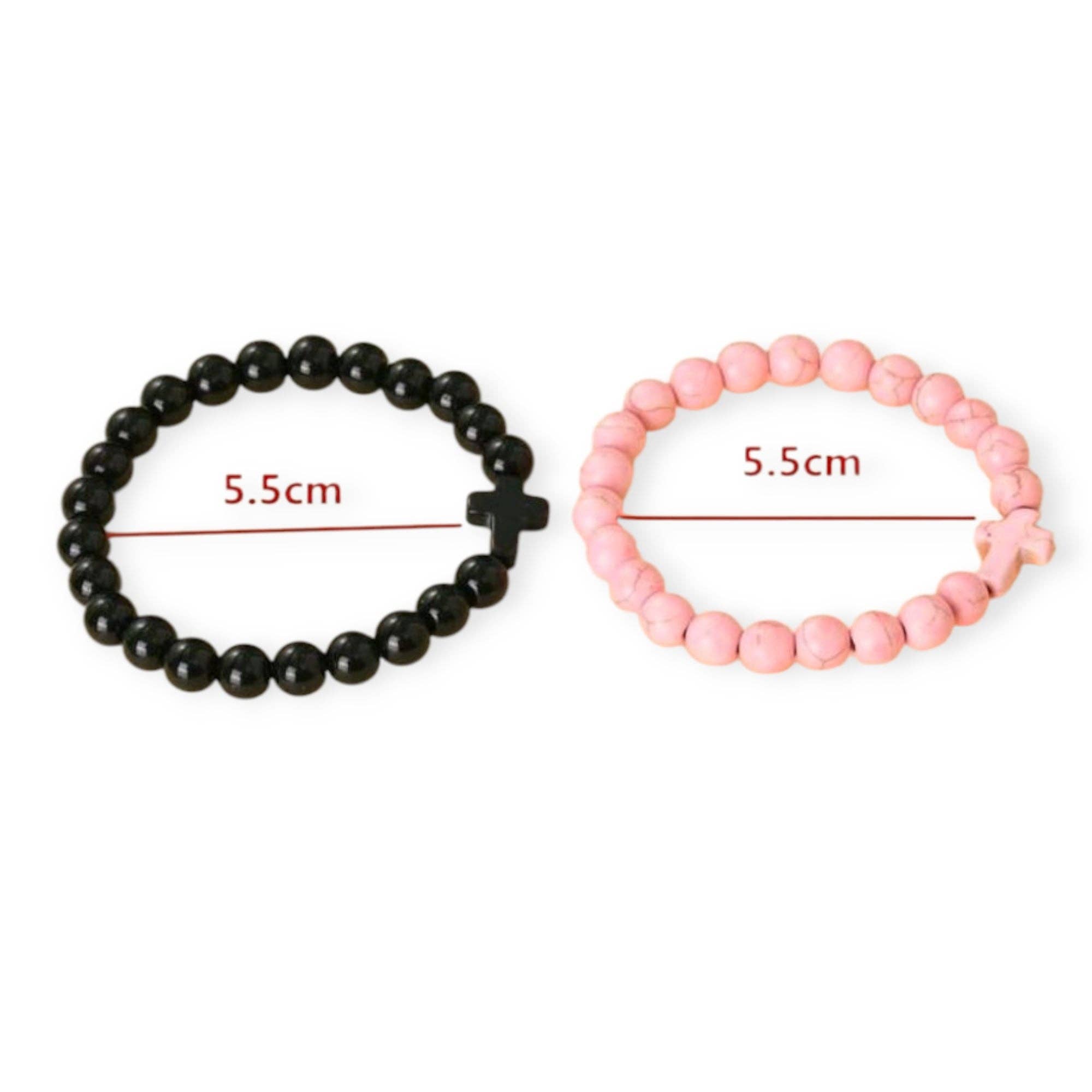 Crackled Stone Stretch Cross Bracelets in Pink or Black