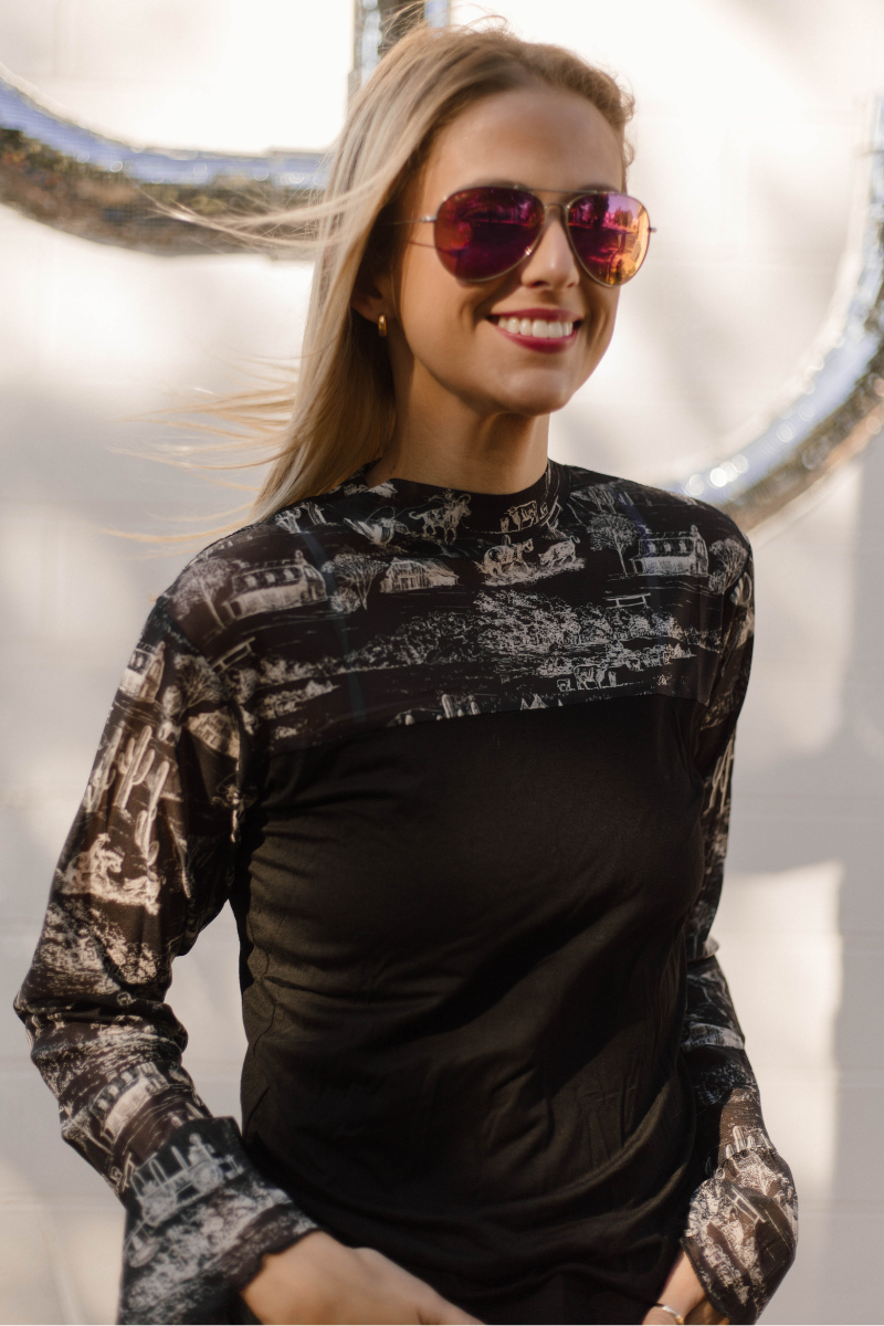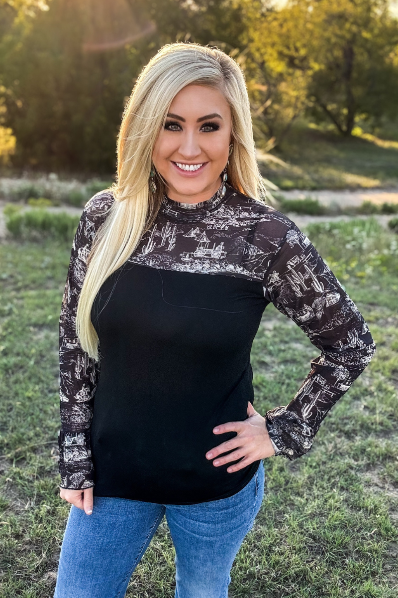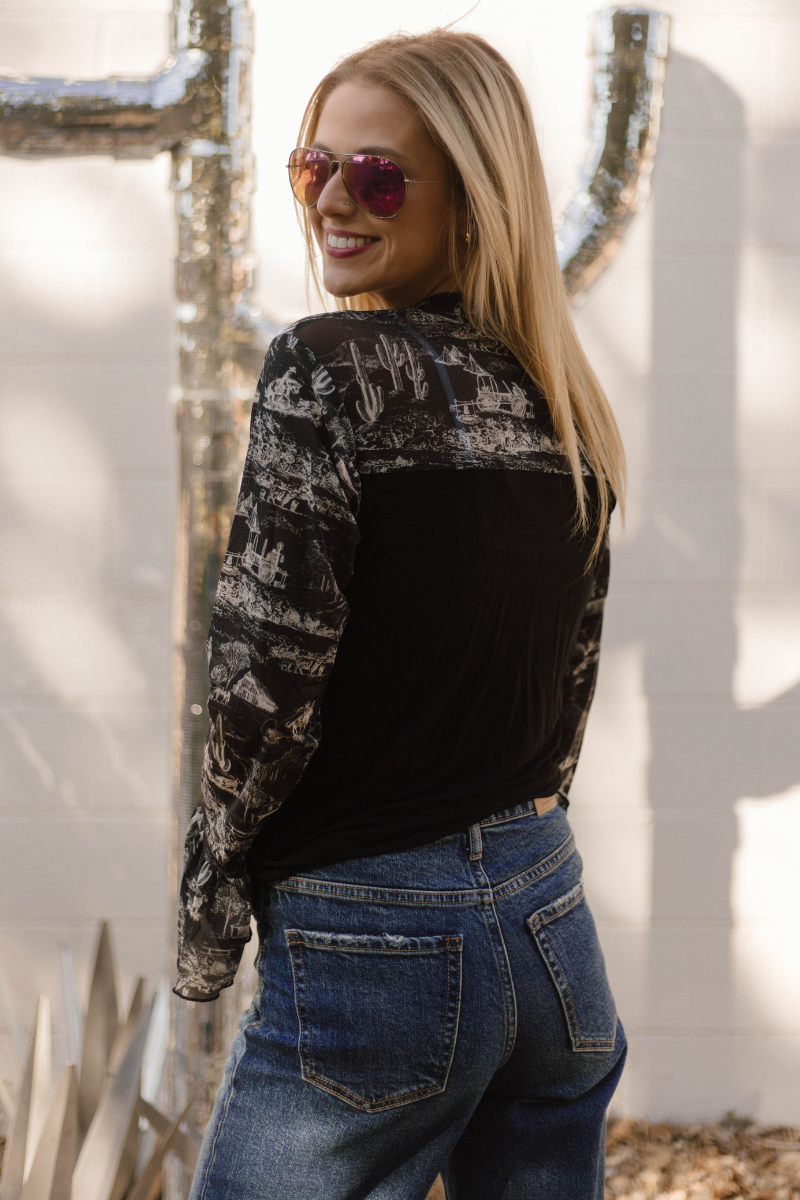 Elevate your wardrobe with the Homestead Toile Top, featuring sleek black fabric complemented by mesh sleeves adorned with a delicate...