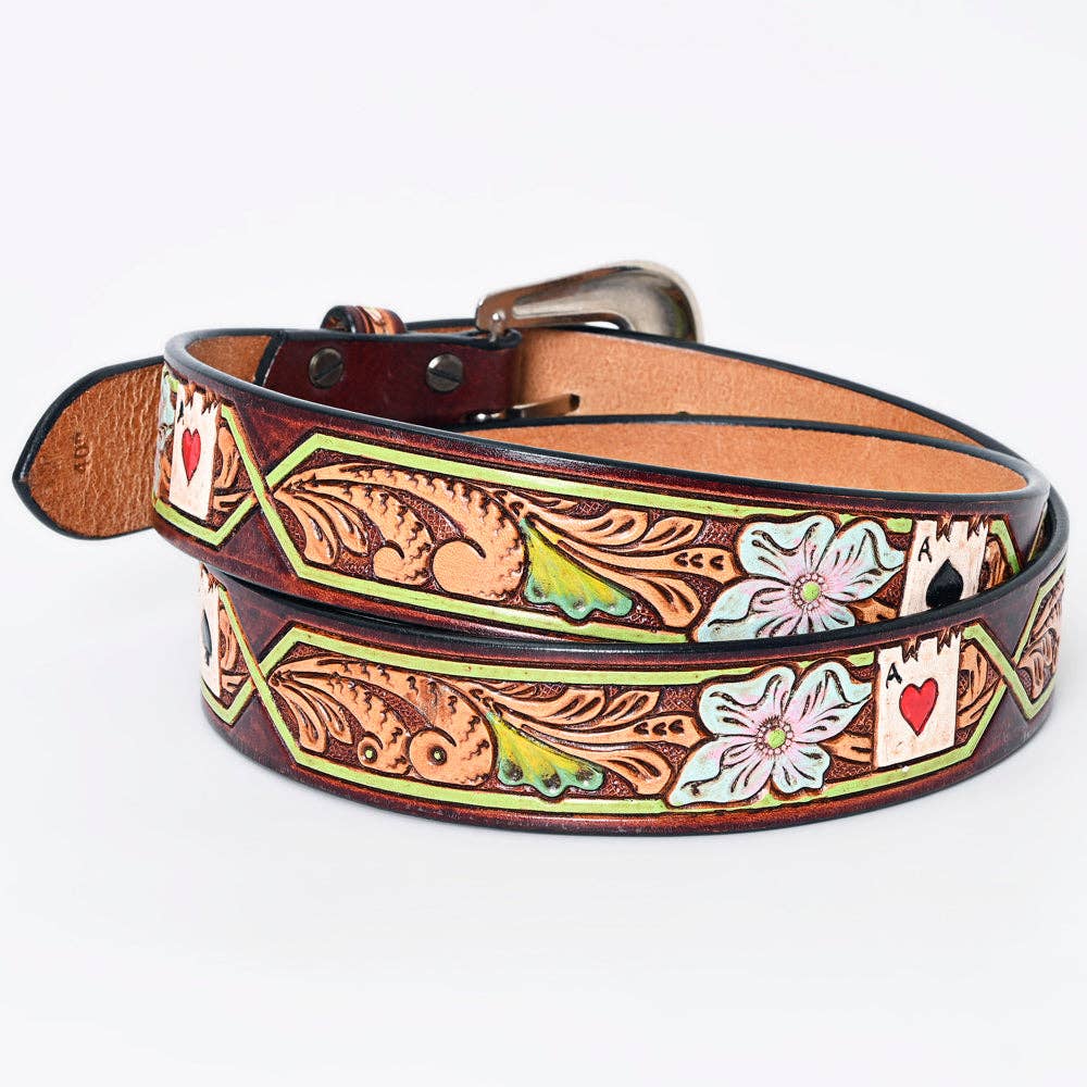 LC-ADBLF156 Tooled Leather Belt - Poker Card Floral Design with Hand-Painted Accents