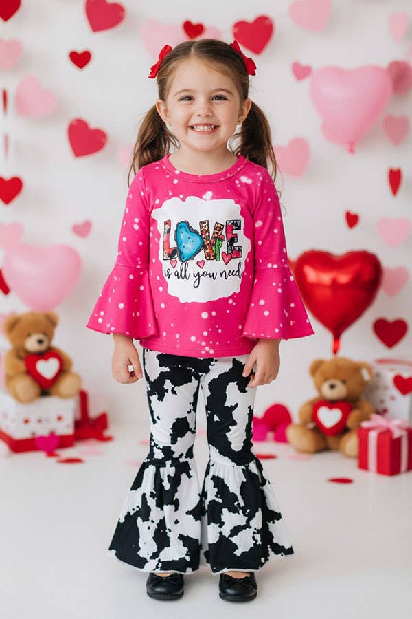 Top features "Love your all you need" wording w/jewel, leopard prints on tie dye pink background & ruffle long sleeves. Bottoms in cow prints w/ falre, match top as a set. Soft, breathable, stretchy, and comfortable fabric. Adorable for all season ,cute western girls' outfit. Material: Polyester & Spandex. Includes: Top & Bottoms.