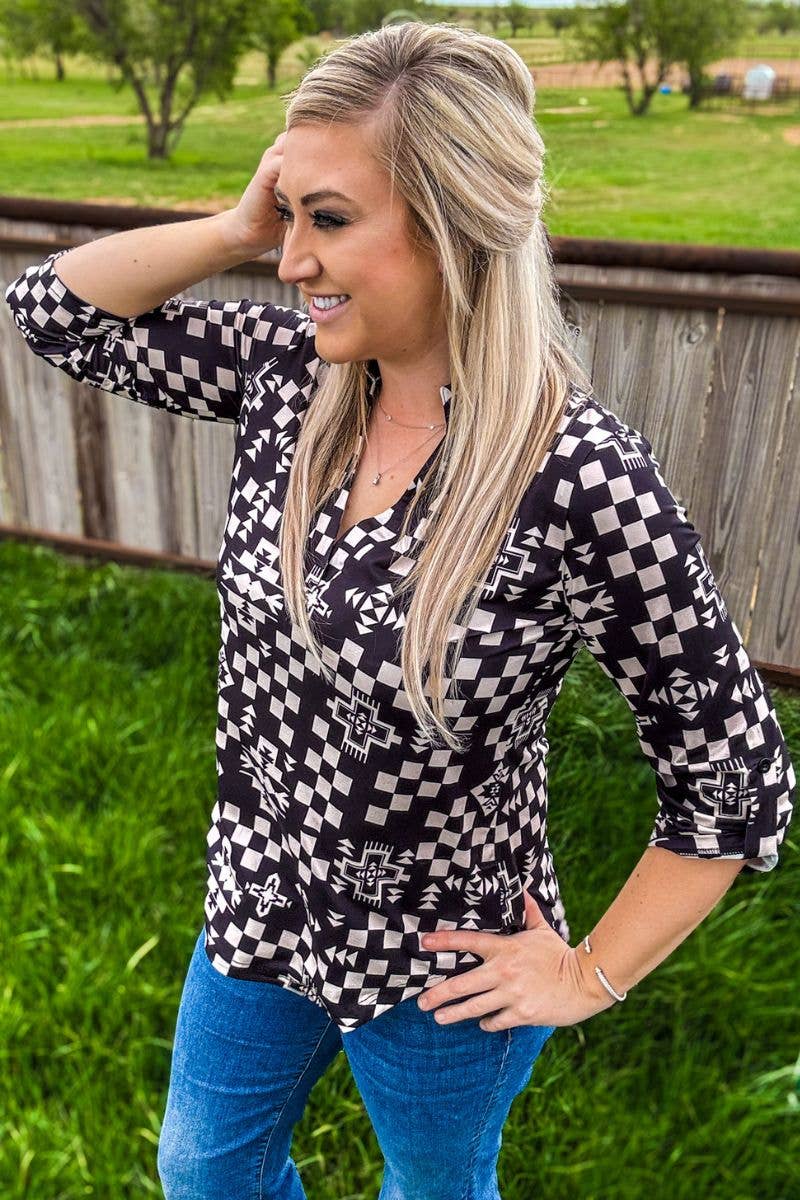 Jazz up your style with our Night Aztec Top. Featuring a cute aztec and checked pattern, you can easily adjust...