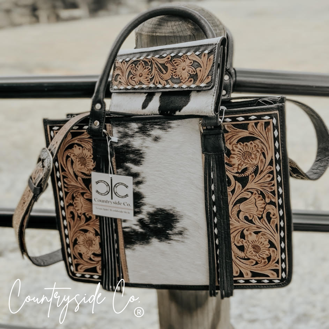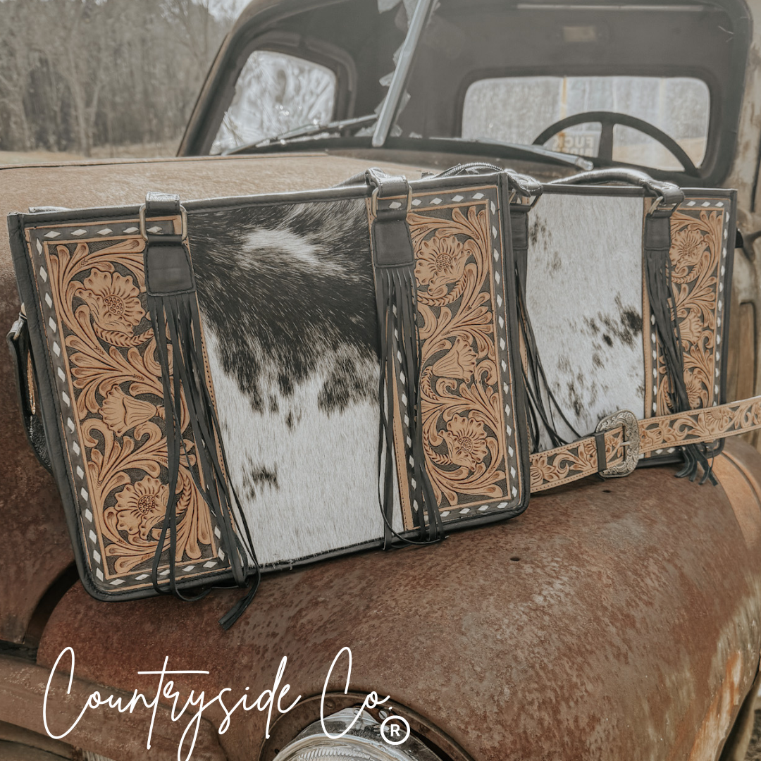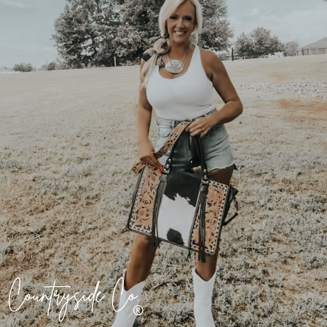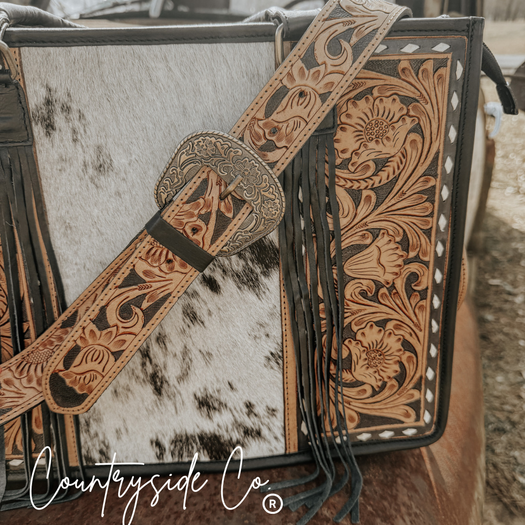 Elevate your style with our Panhandle Cowhide Tote and Laptop Bag by Countryside Co. The front features intricate tooled leather...