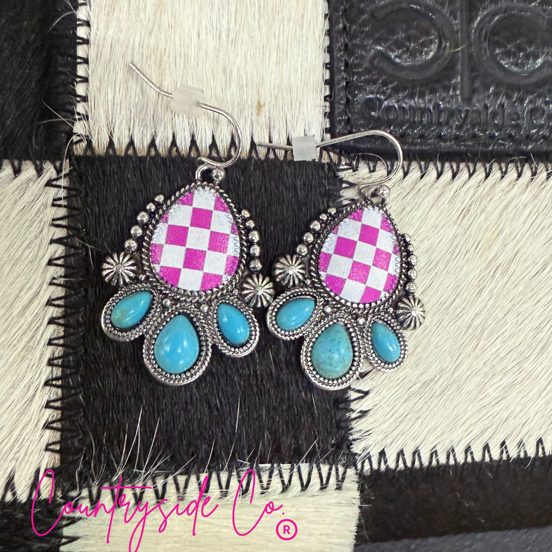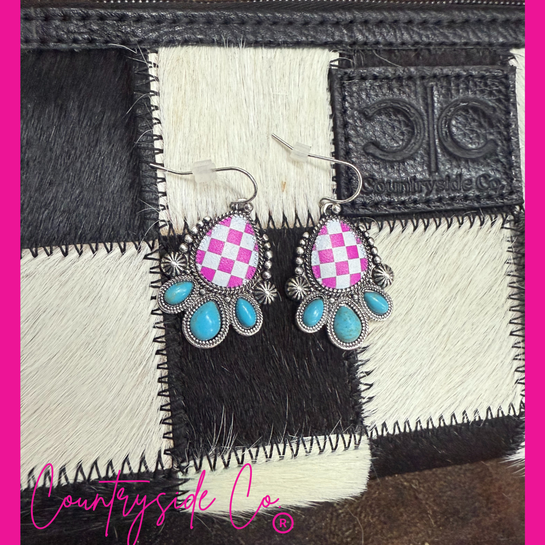 Punchy Western Pink Checkered Earrings are crafted in an intricately detailed silver setting with faux turquoise stone accents. These lightweight,...