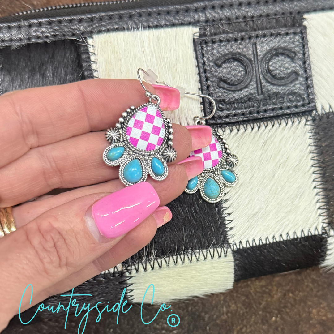 Punchy Western Pink Checkered Dangle Earrings