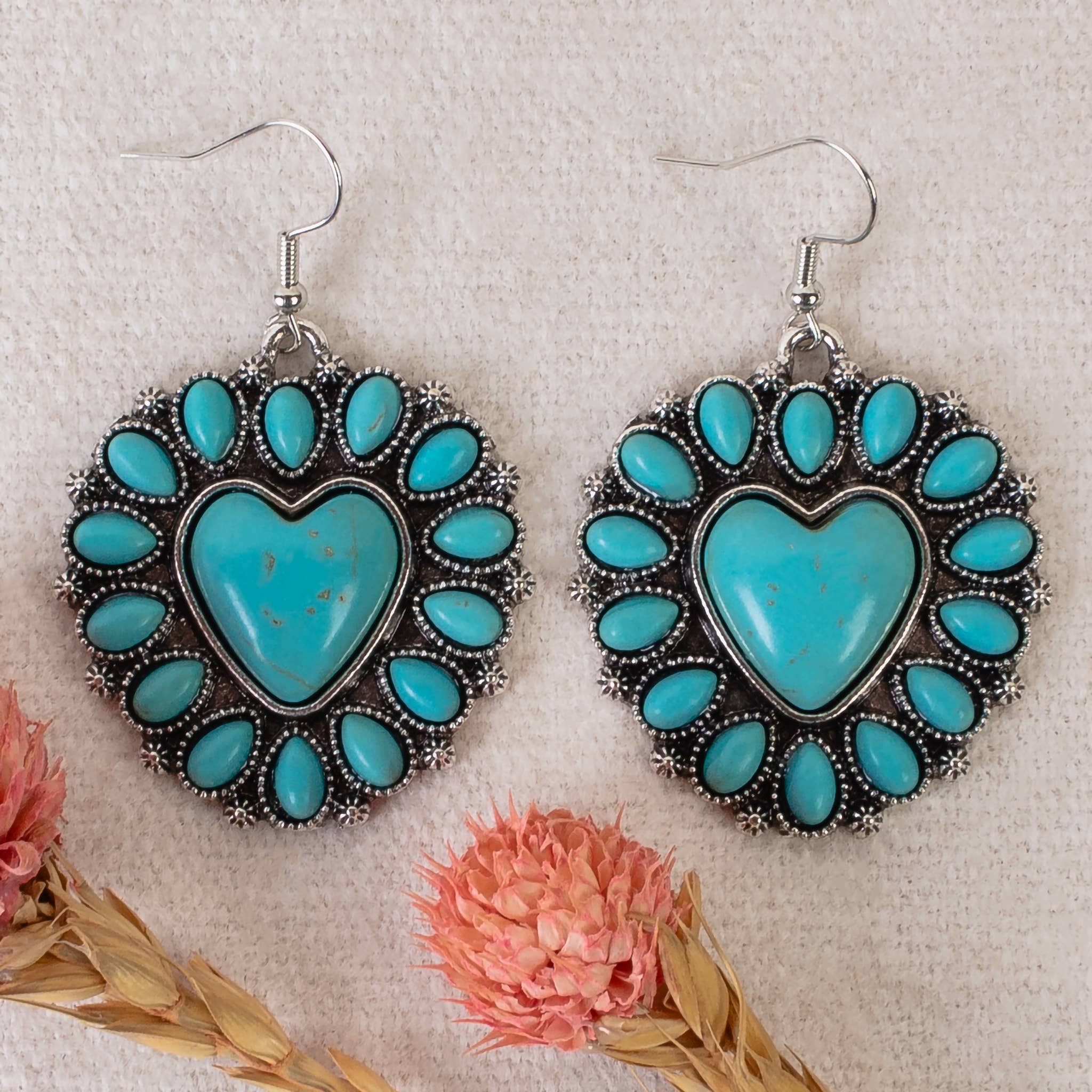 Squash Blossom Heart Earrings Turquoise Stone Details Fish Hook 2" in Length By: EMMA