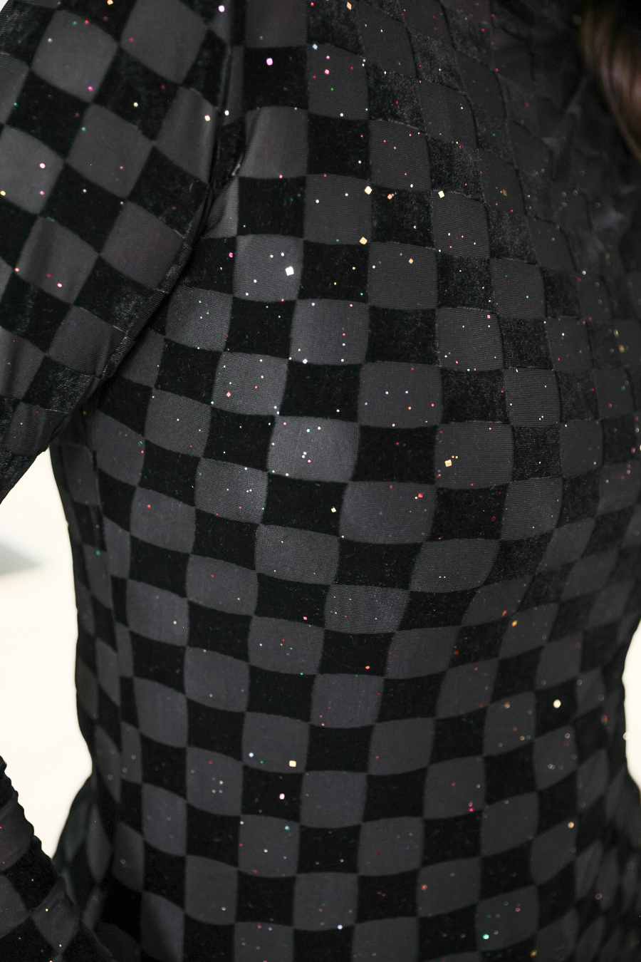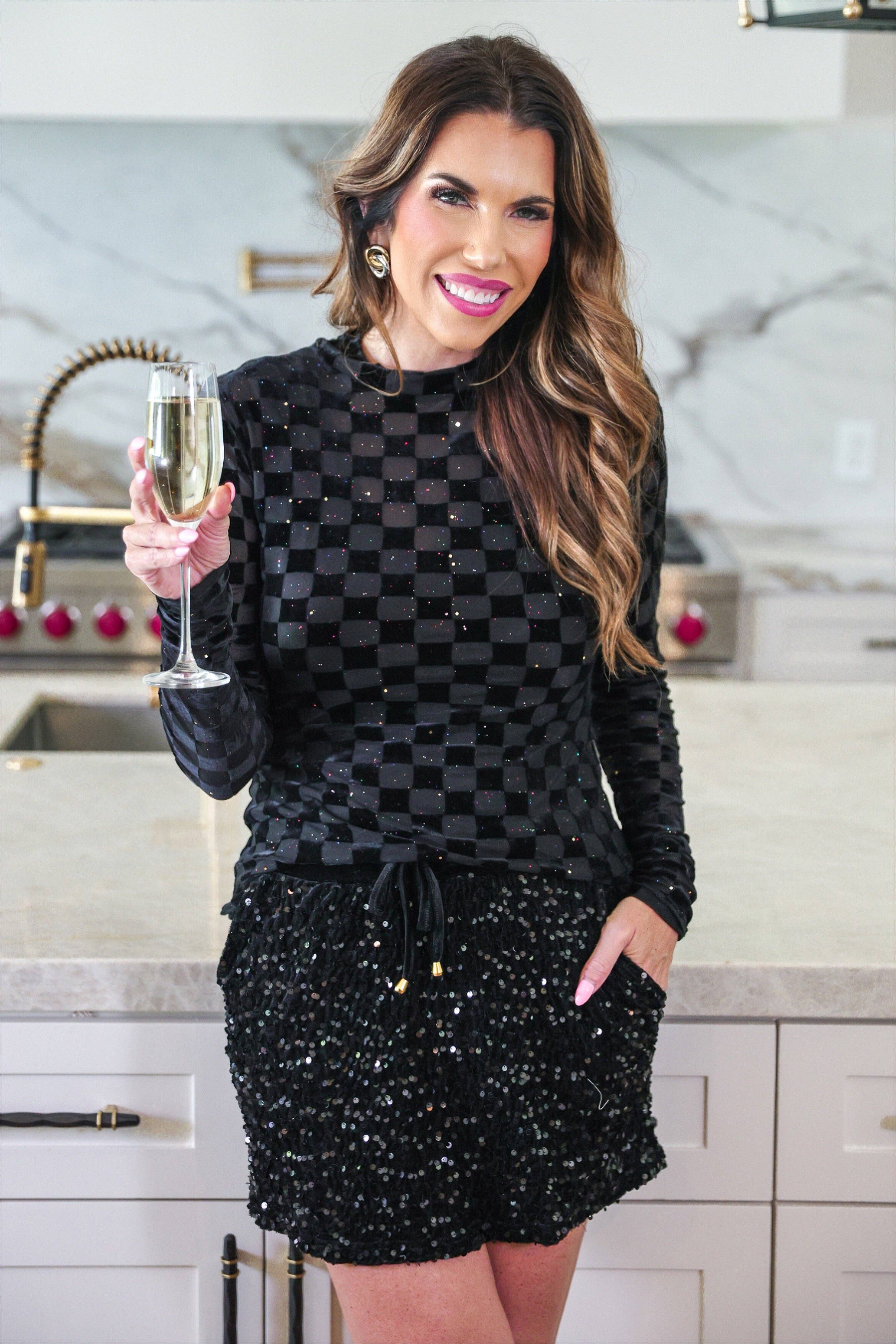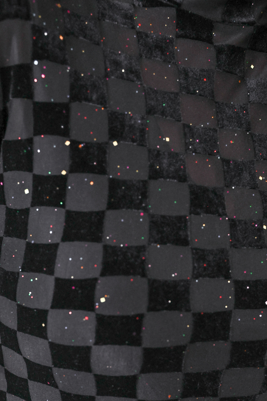 Enhance your wardrobe with the Times Square Velvet Mesh Top in Black Checkered. Featuring delicate lettuce-edge hems, a stylish mock...