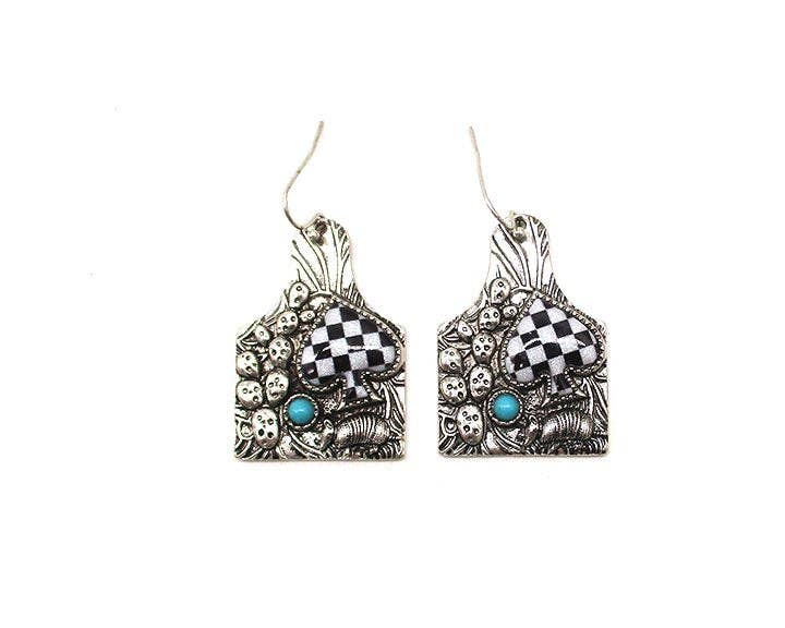 WESTERN CATTLE TAG ARMADILLO SPADE CHECKER EARRINGS
