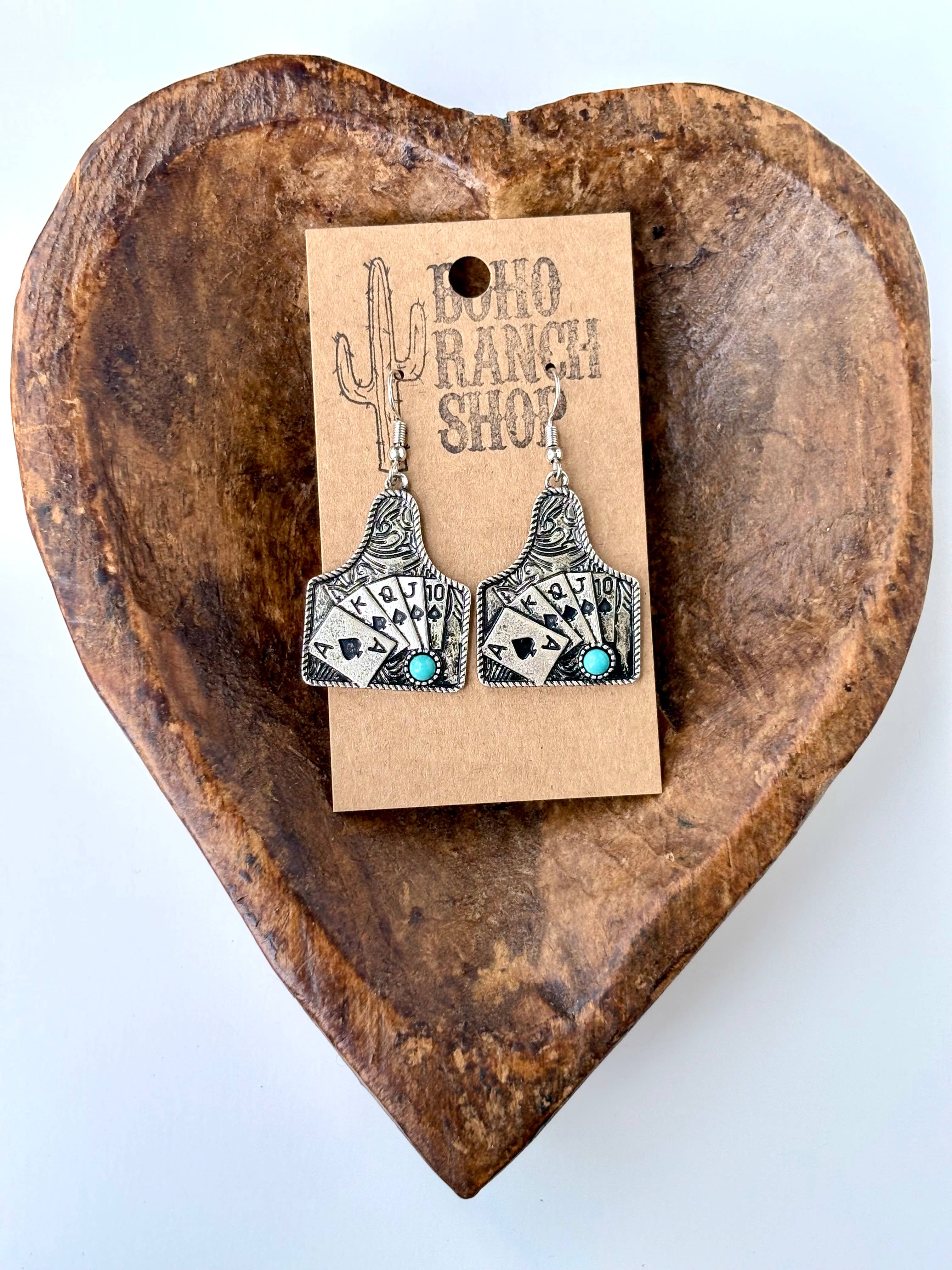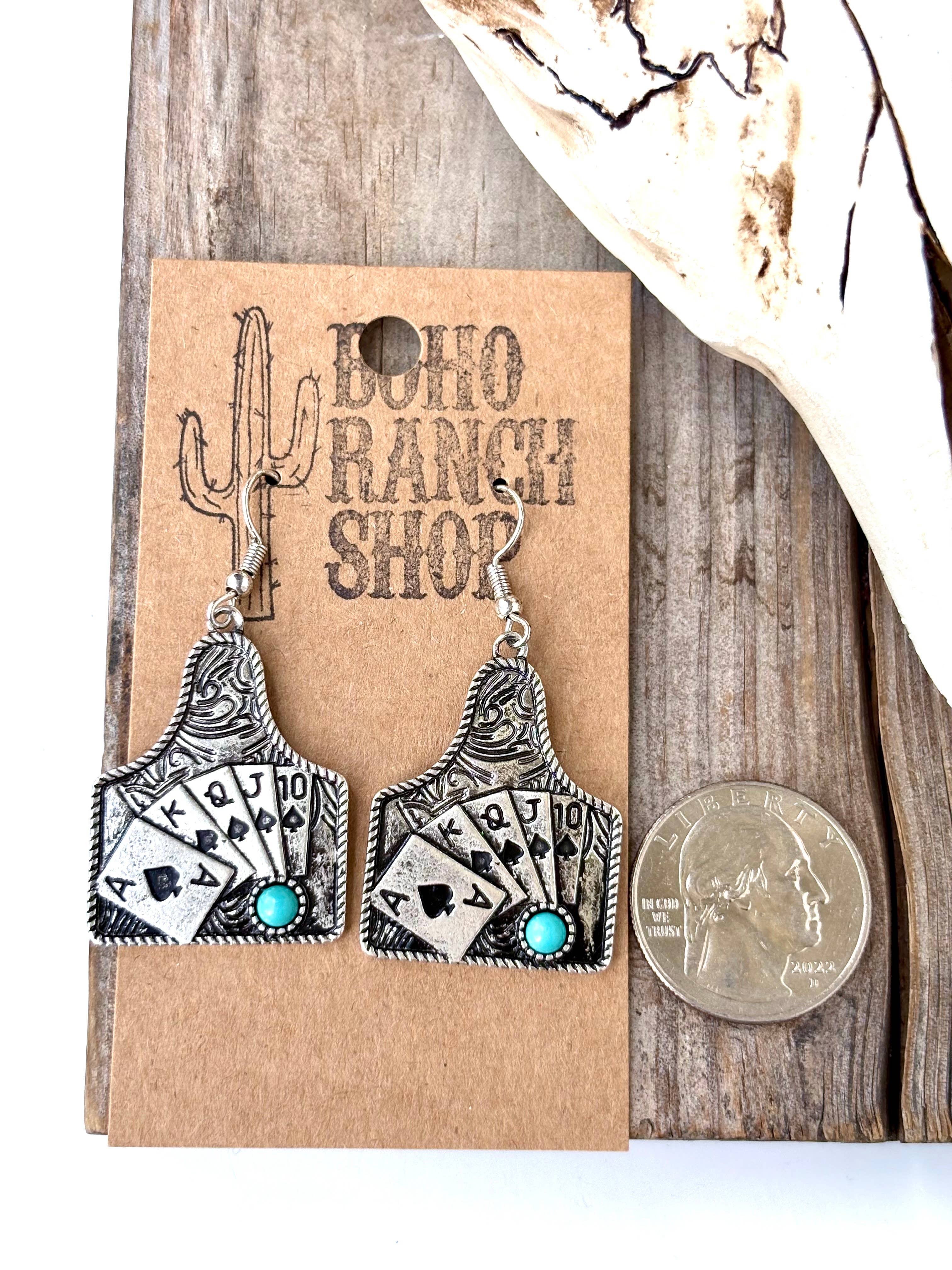 Western Playing Card with Stone Drop Dangle Earrings Size: 2"L Fishhook Back Brushed Silver, Turquoise Stone, Stone Lead Compliant