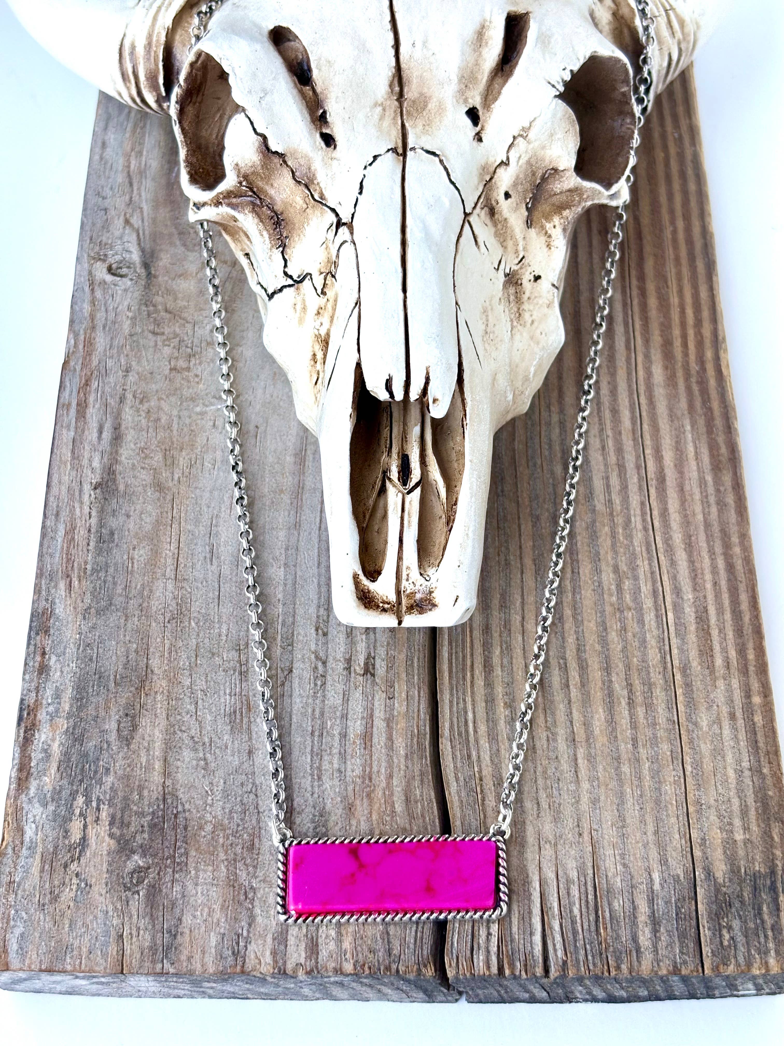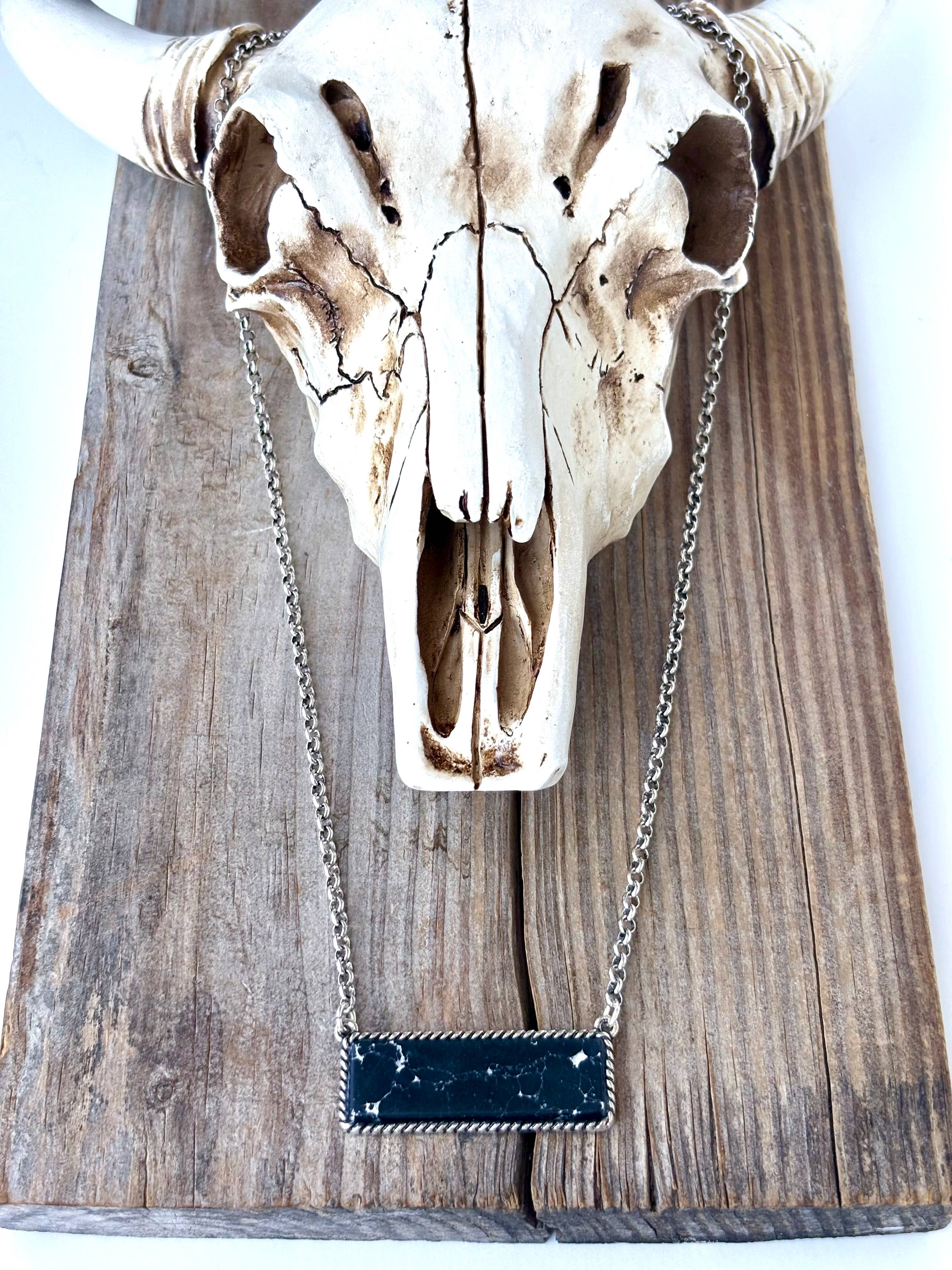 Western Style Stone Bar Pendant Necklace Size: 20"L + 3"L Pendant: 1.5"W x 0.5"L Lobster Claw Clasps Brushed Silver, Turquoise...