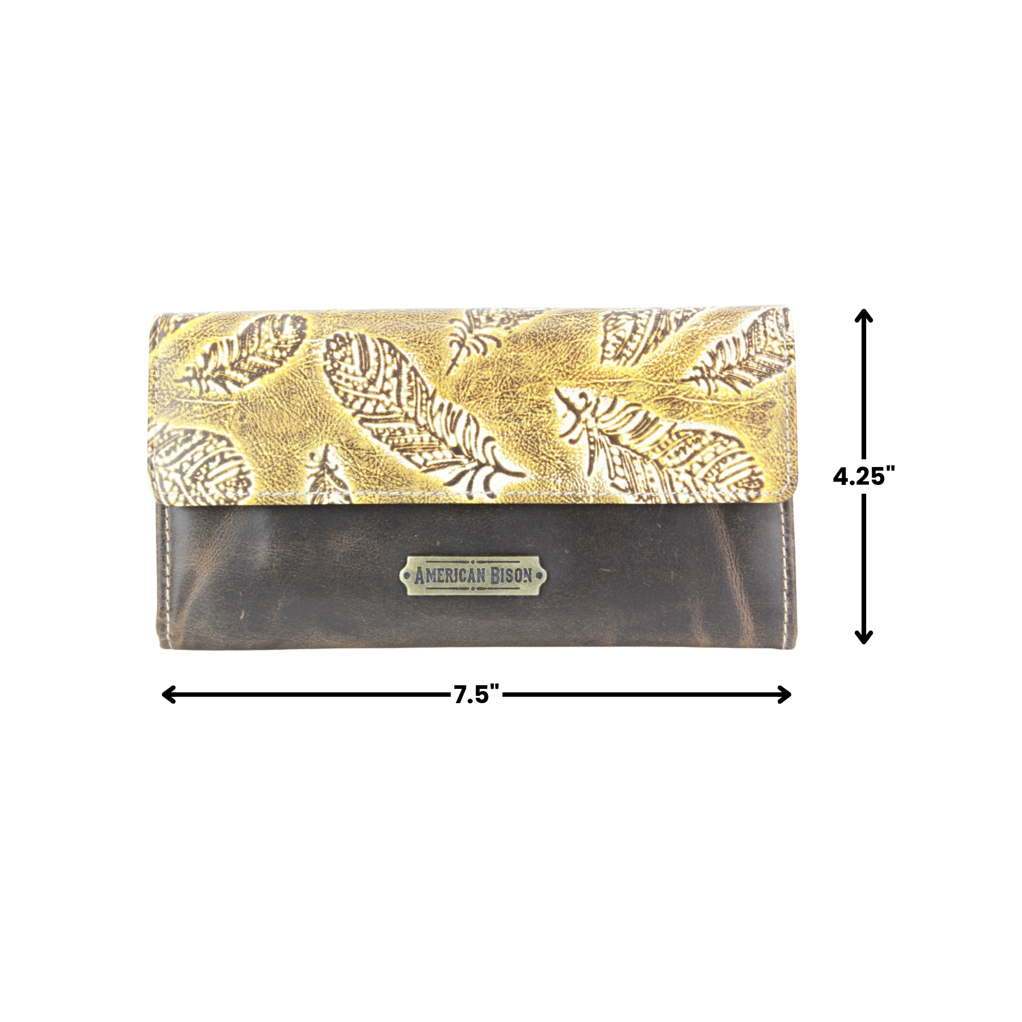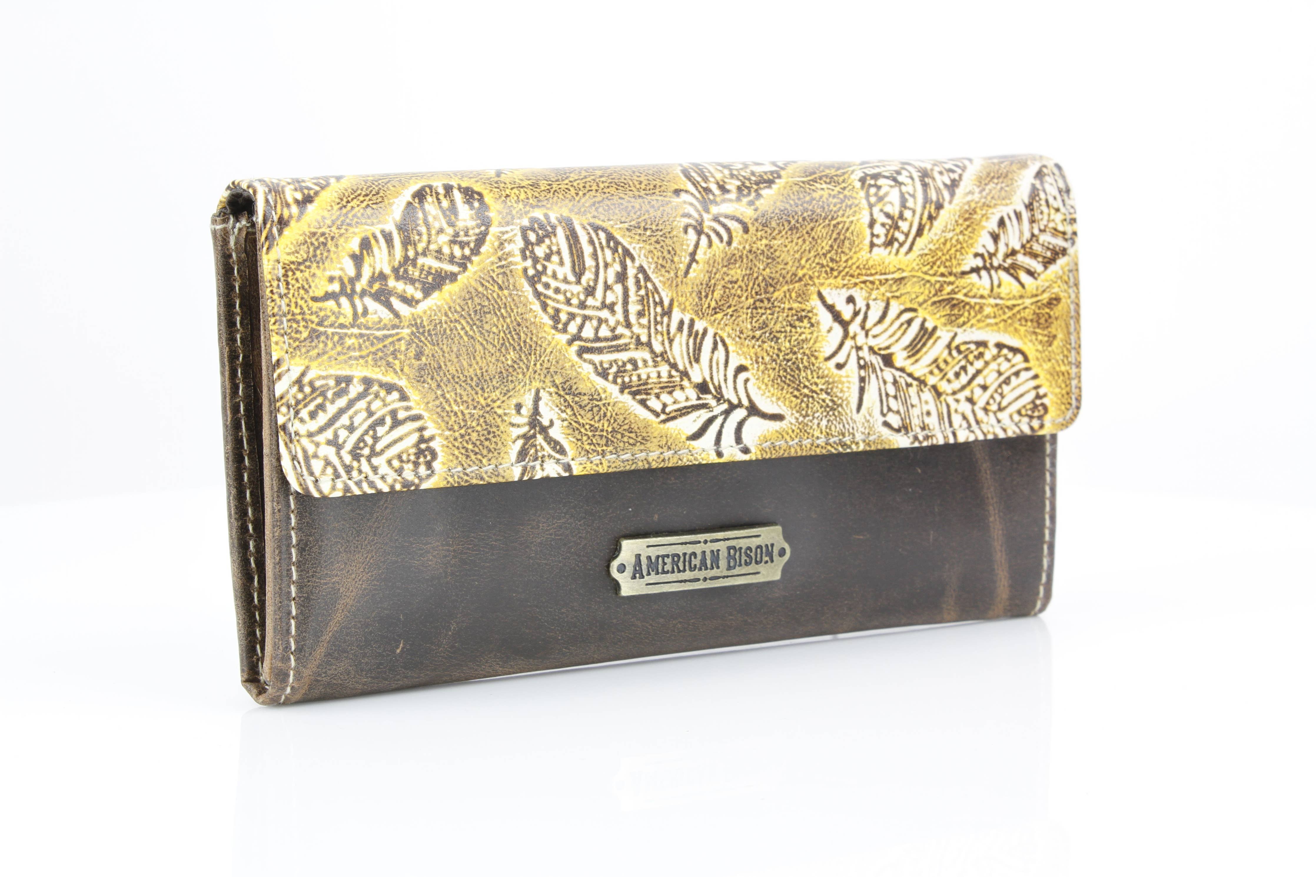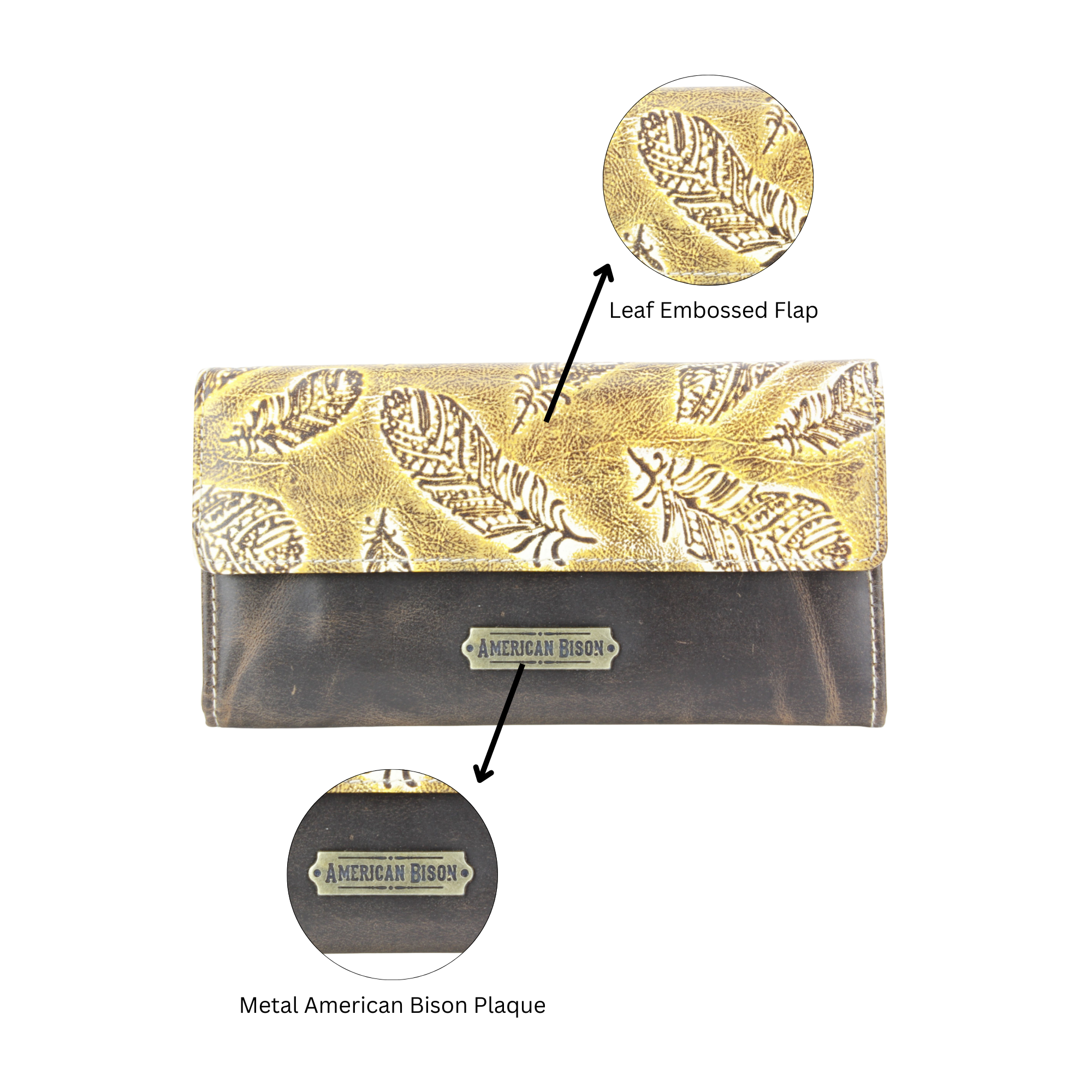 This women’s clutch wallet features a flap embossed with a leaf pattern in tan and brown, offering a subtle yet...