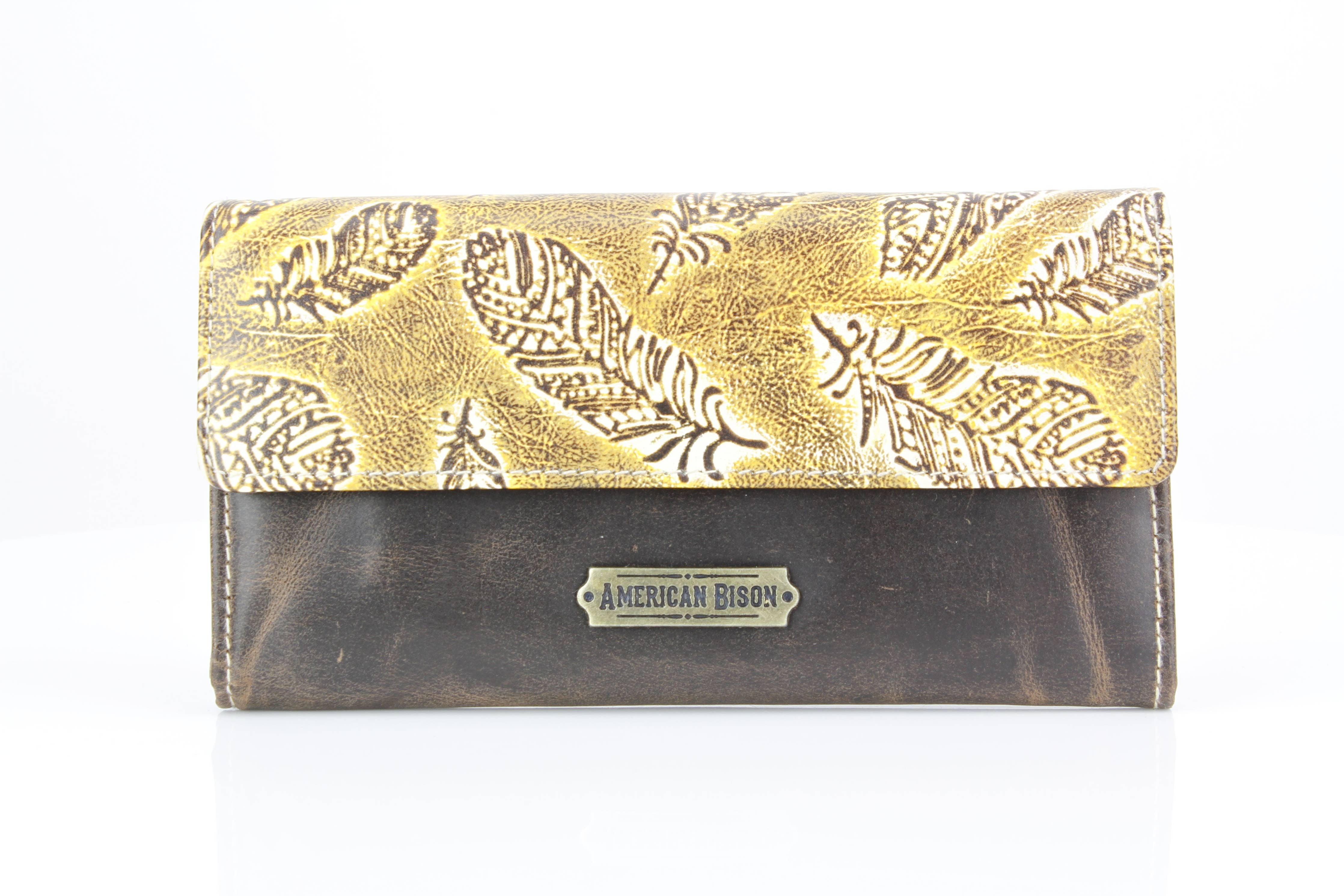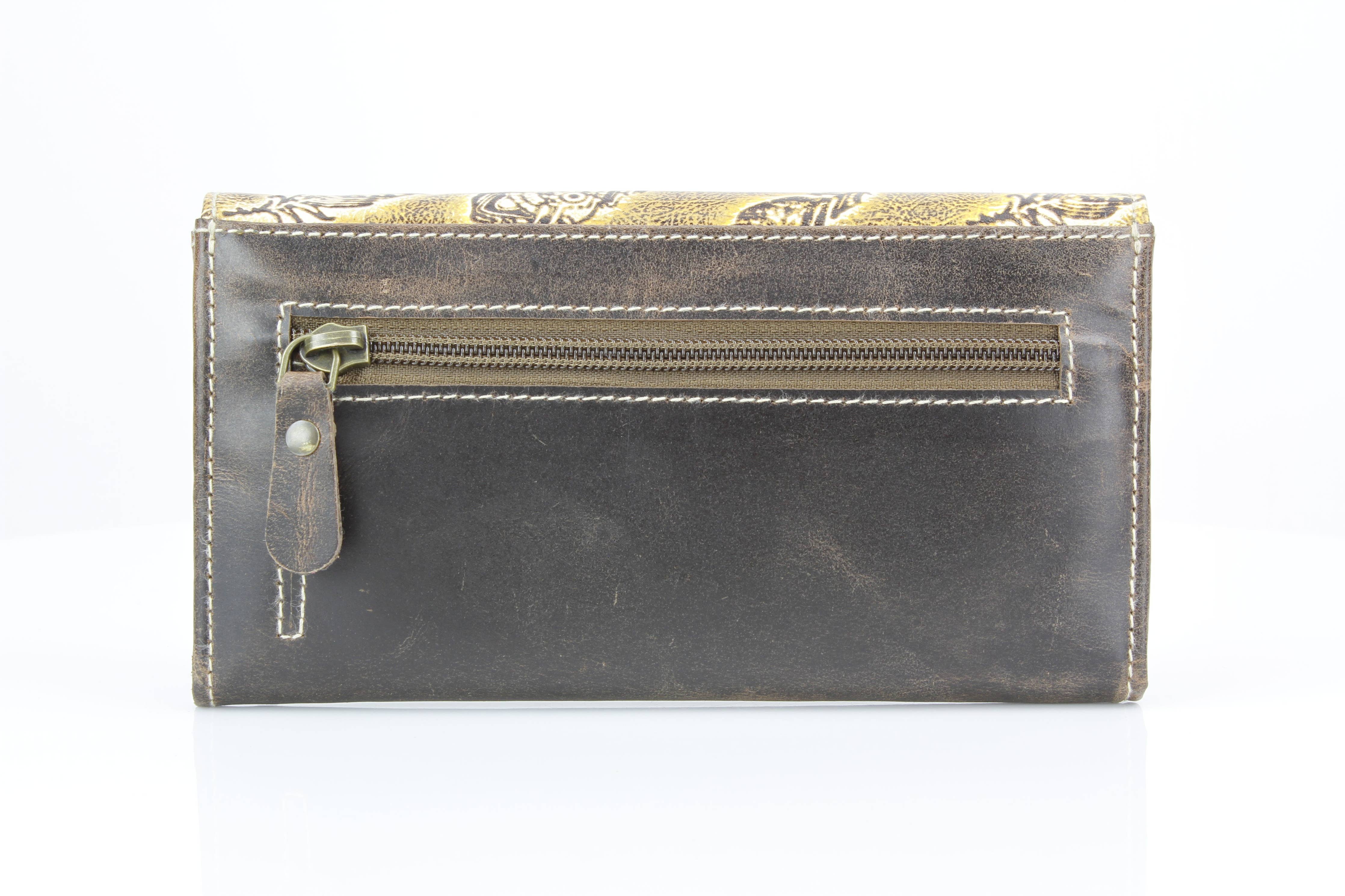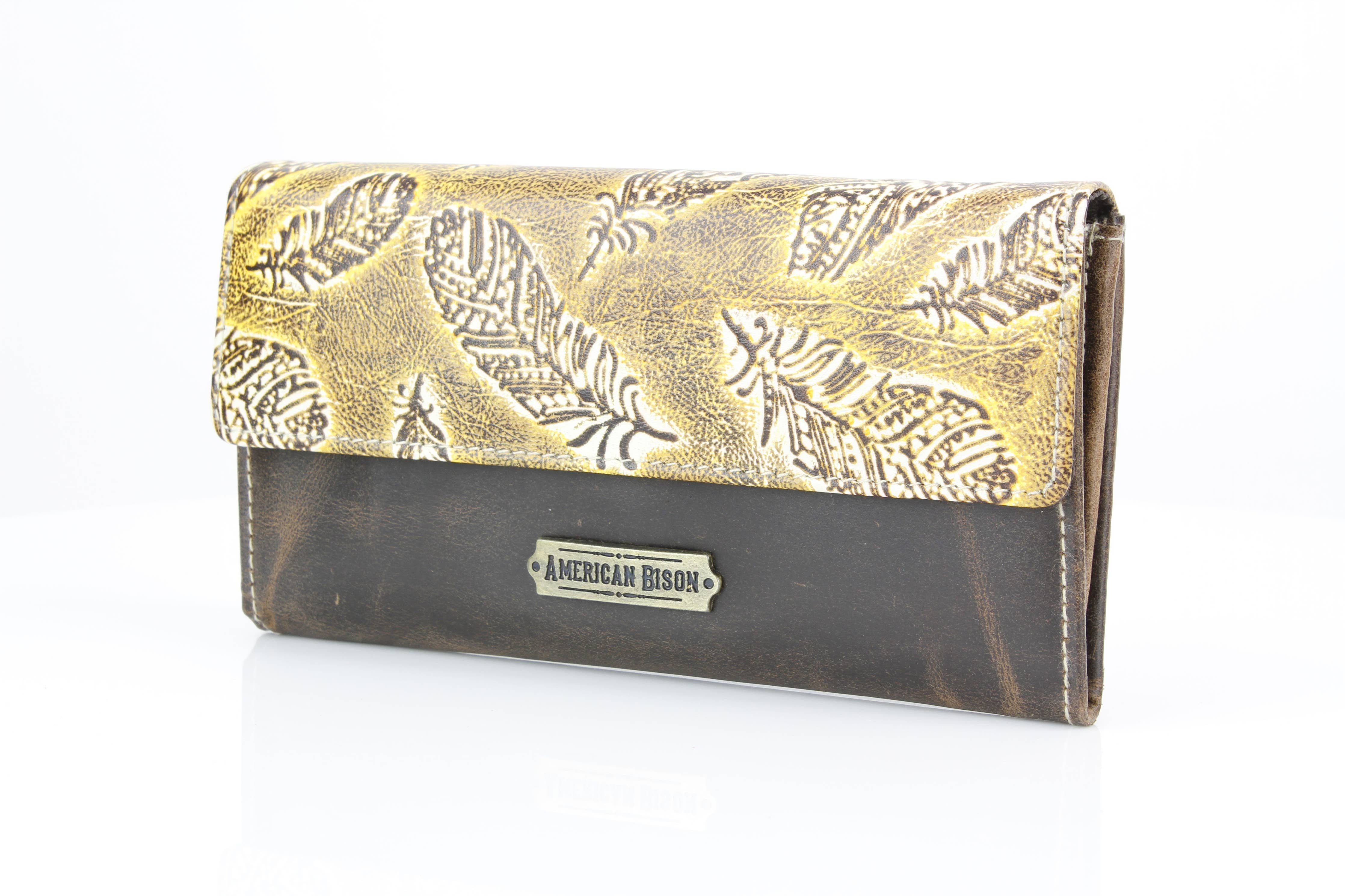This women’s clutch wallet features a flap embossed with a leaf pattern in tan and brown, offering a subtle yet...