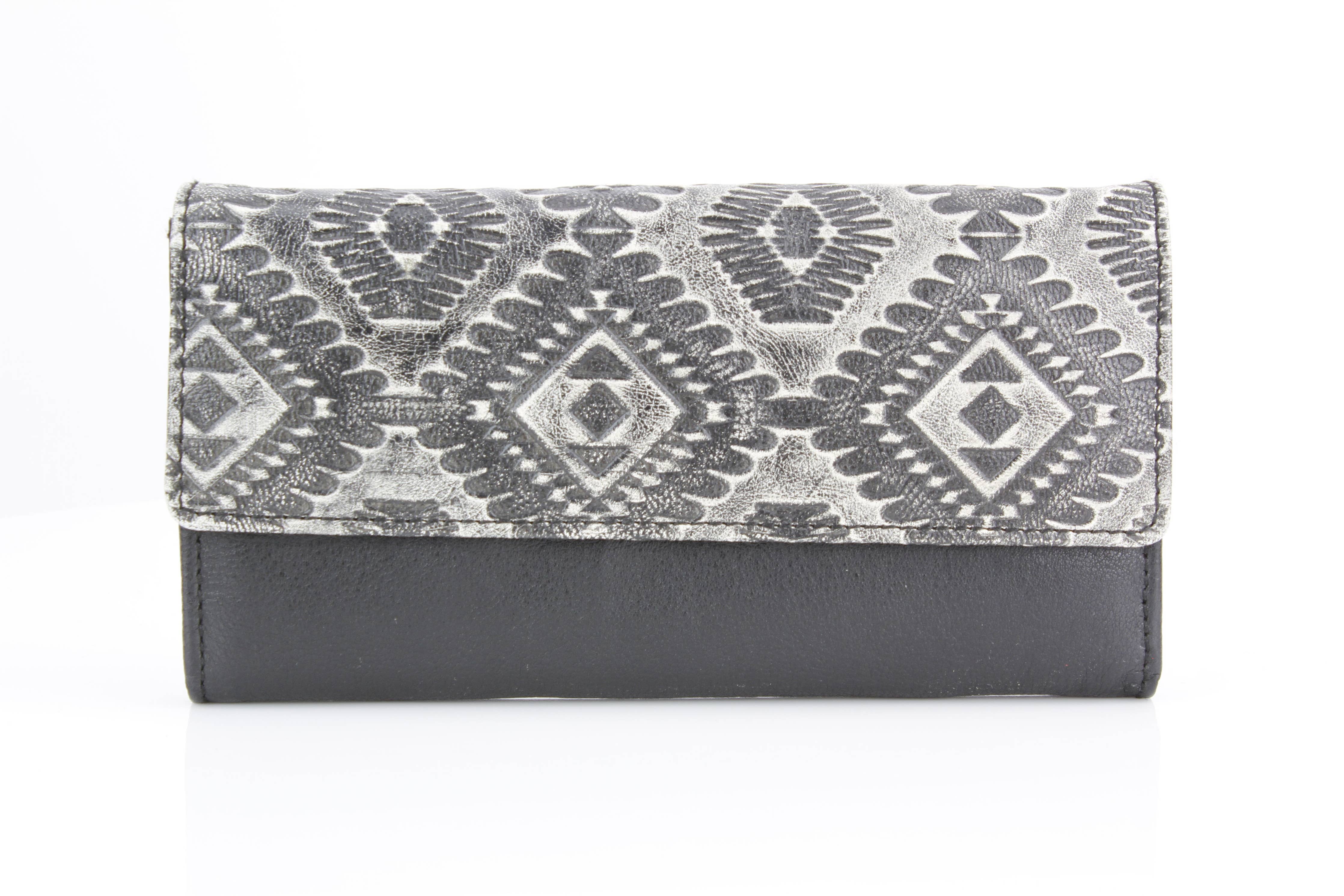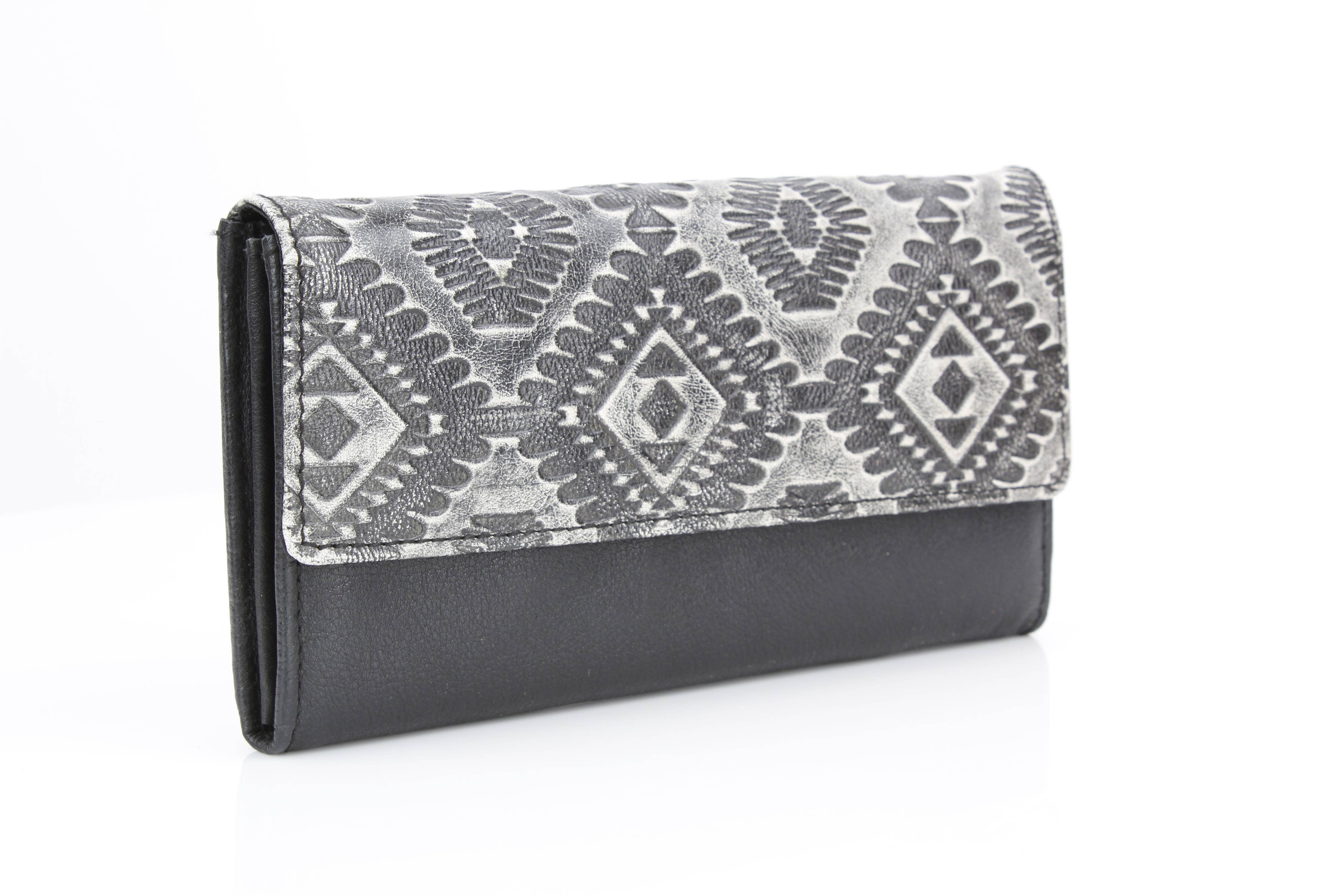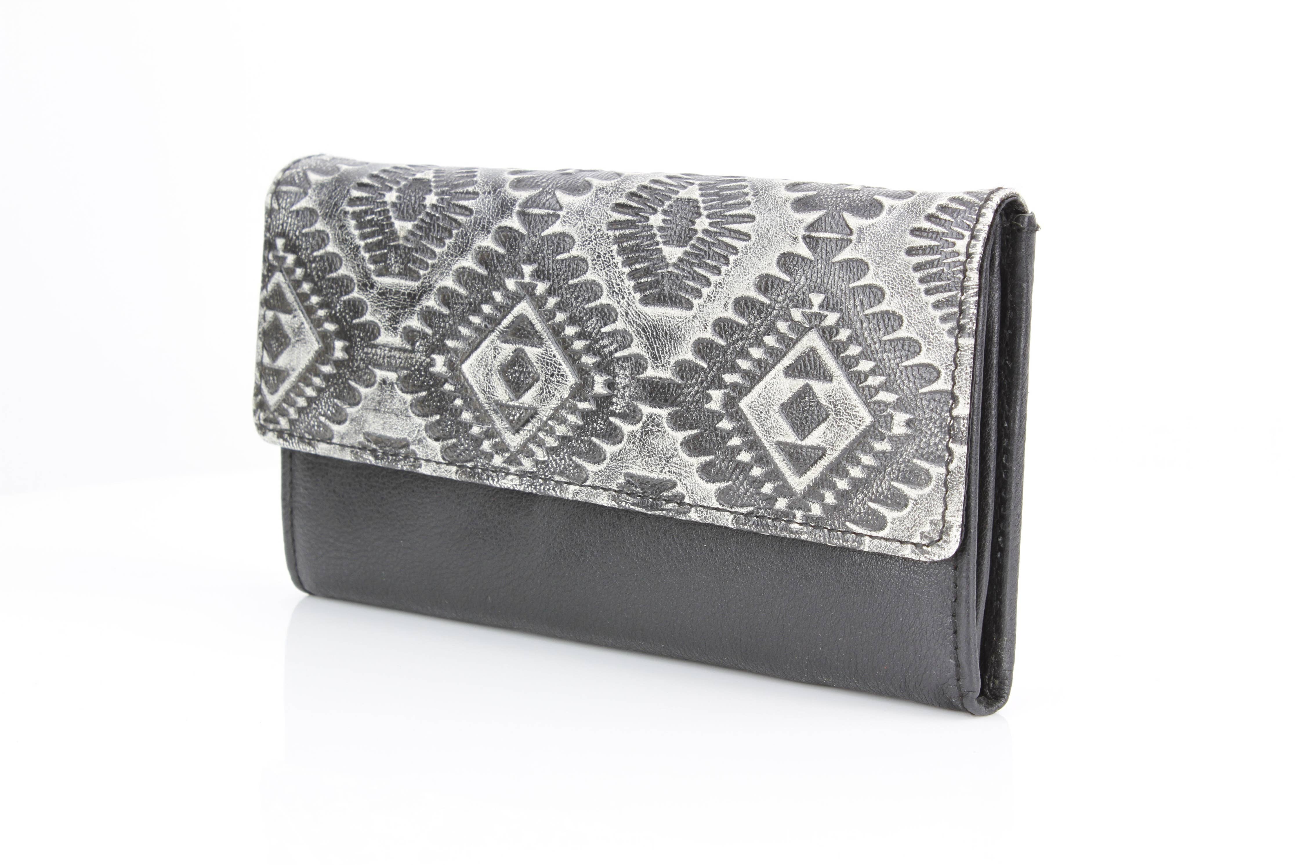 This women’s clutch wallet features a bold Southwestern Aztec-inspired embossed design in grey and black, delivering a striking contrast with...