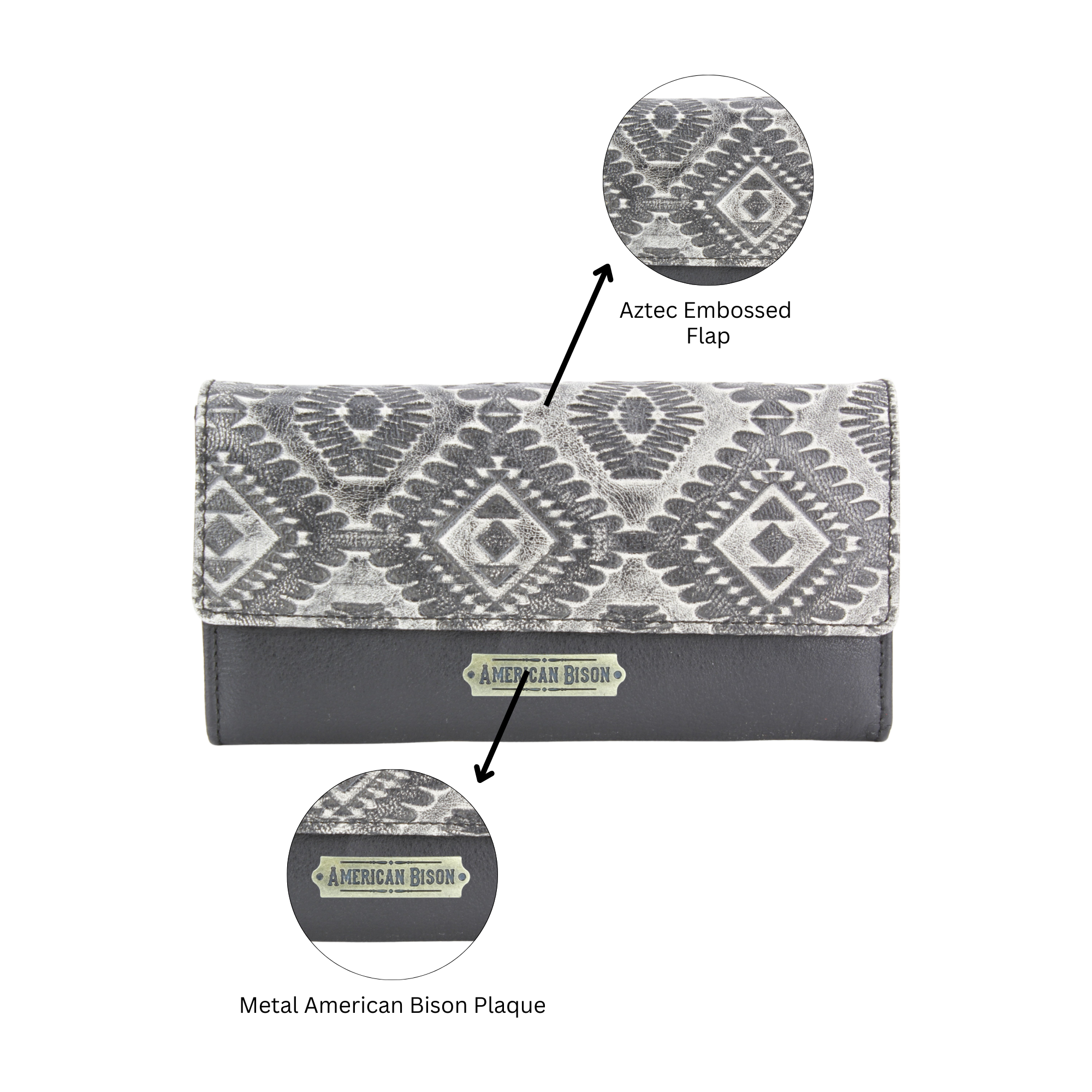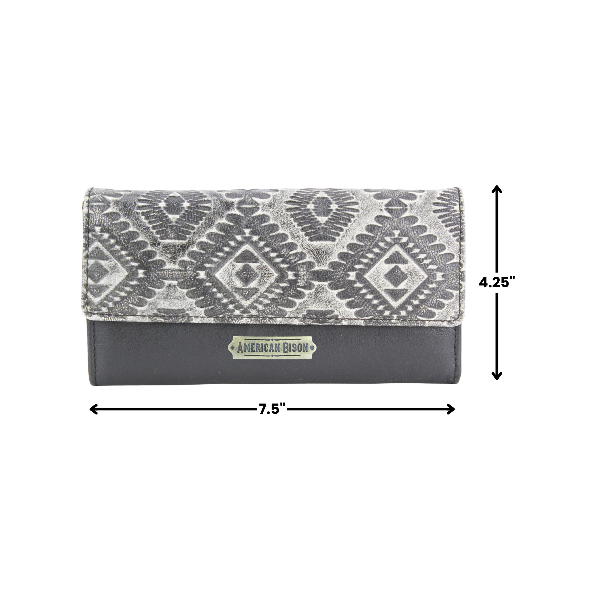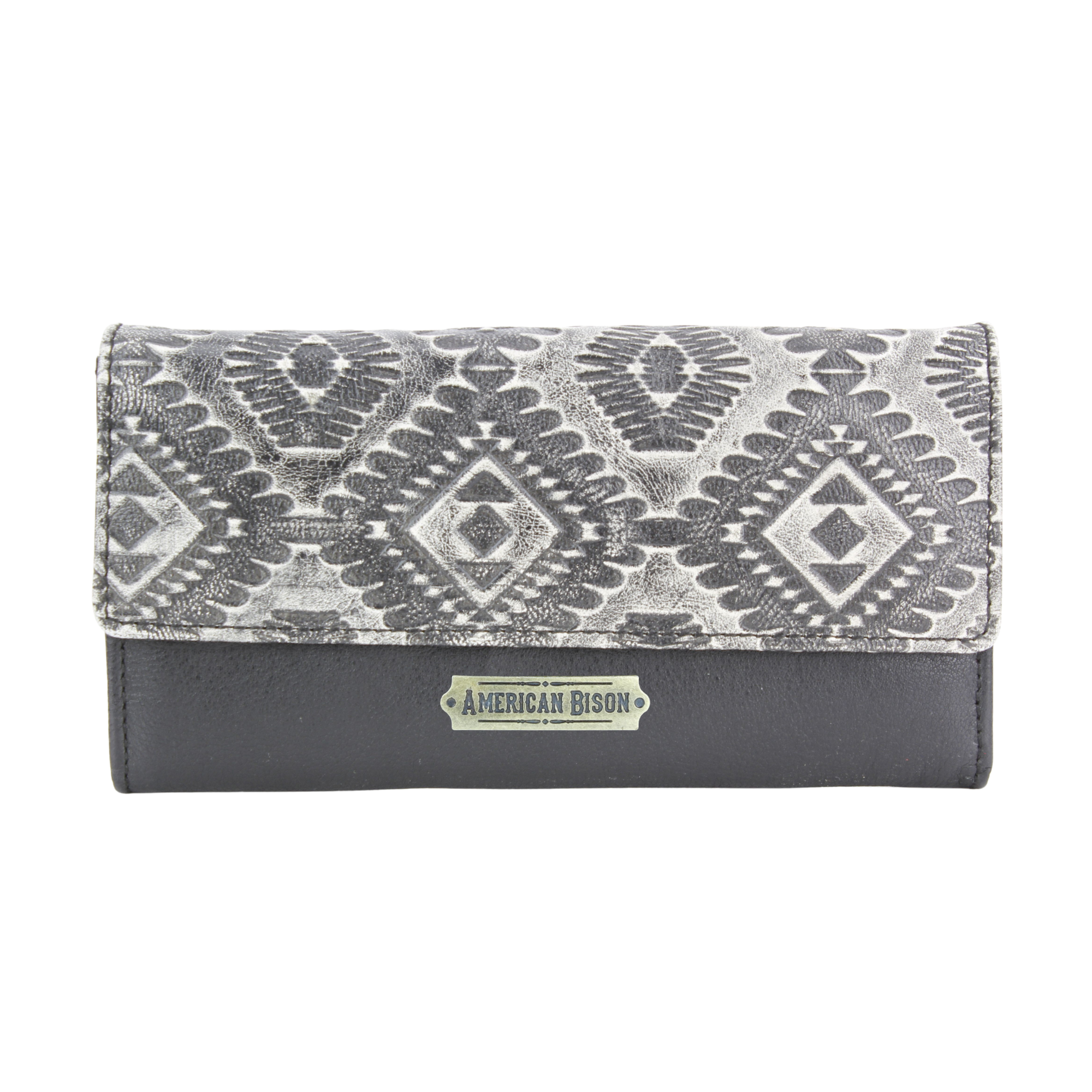 This women’s clutch wallet features a bold Southwestern Aztec-inspired embossed design in grey and black, delivering a striking contrast with...