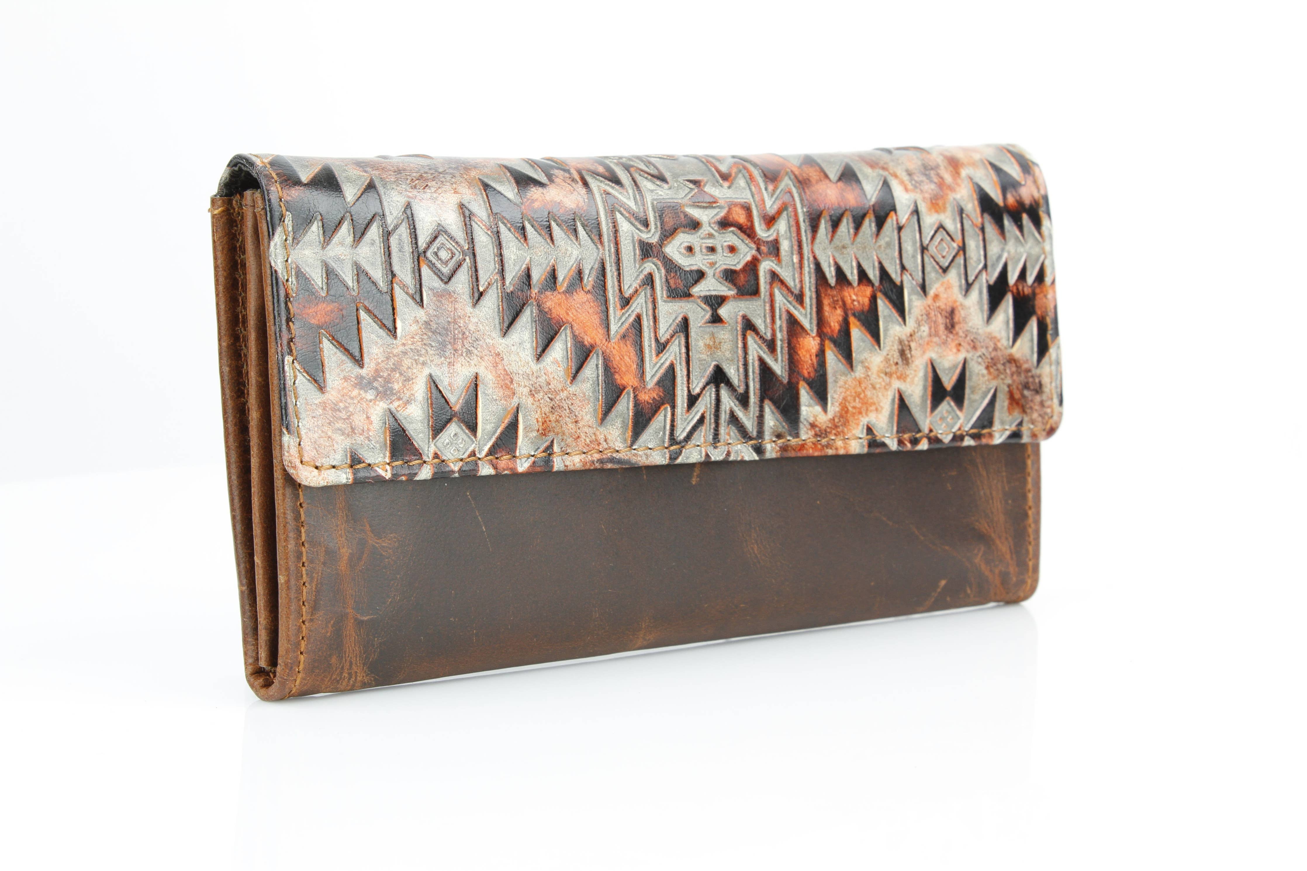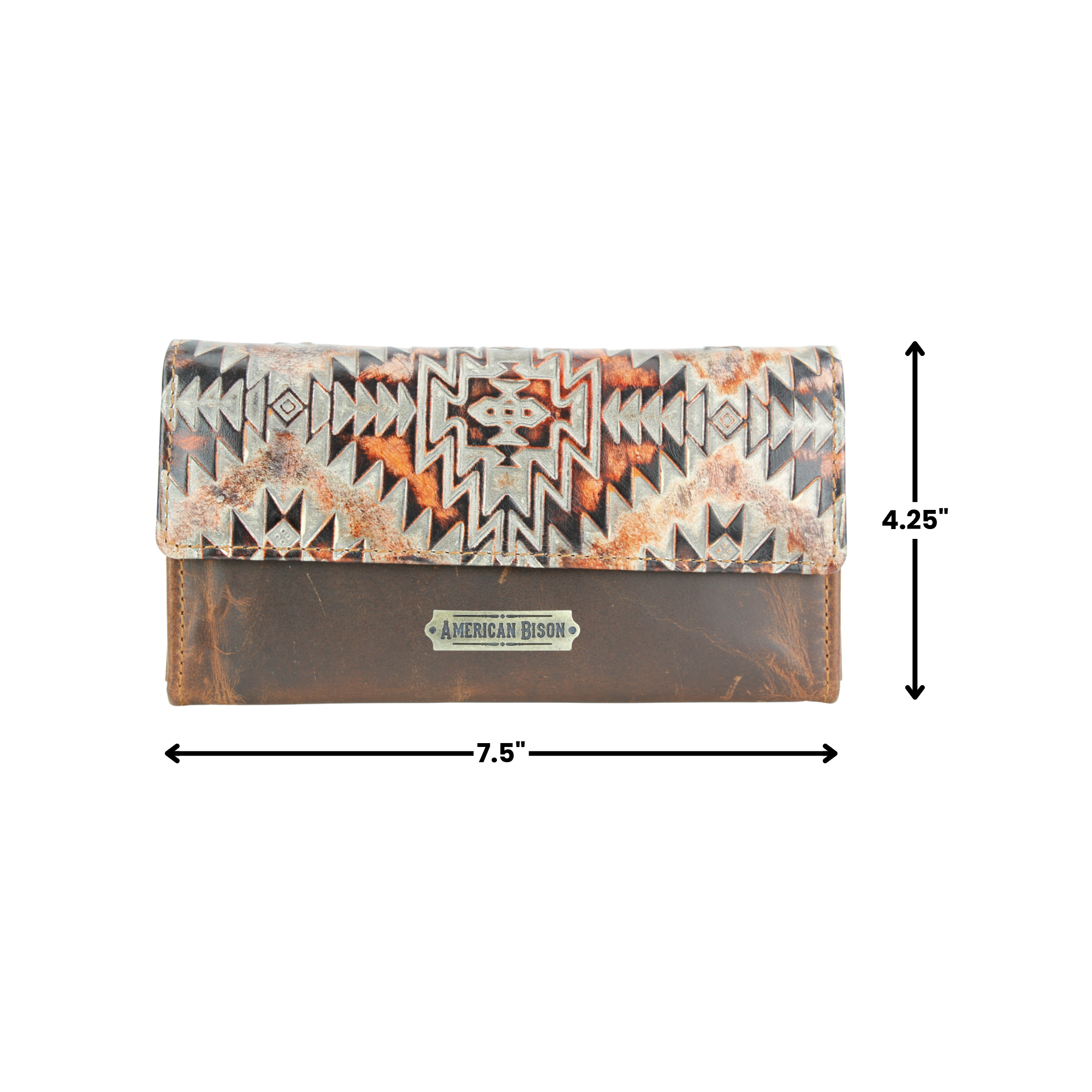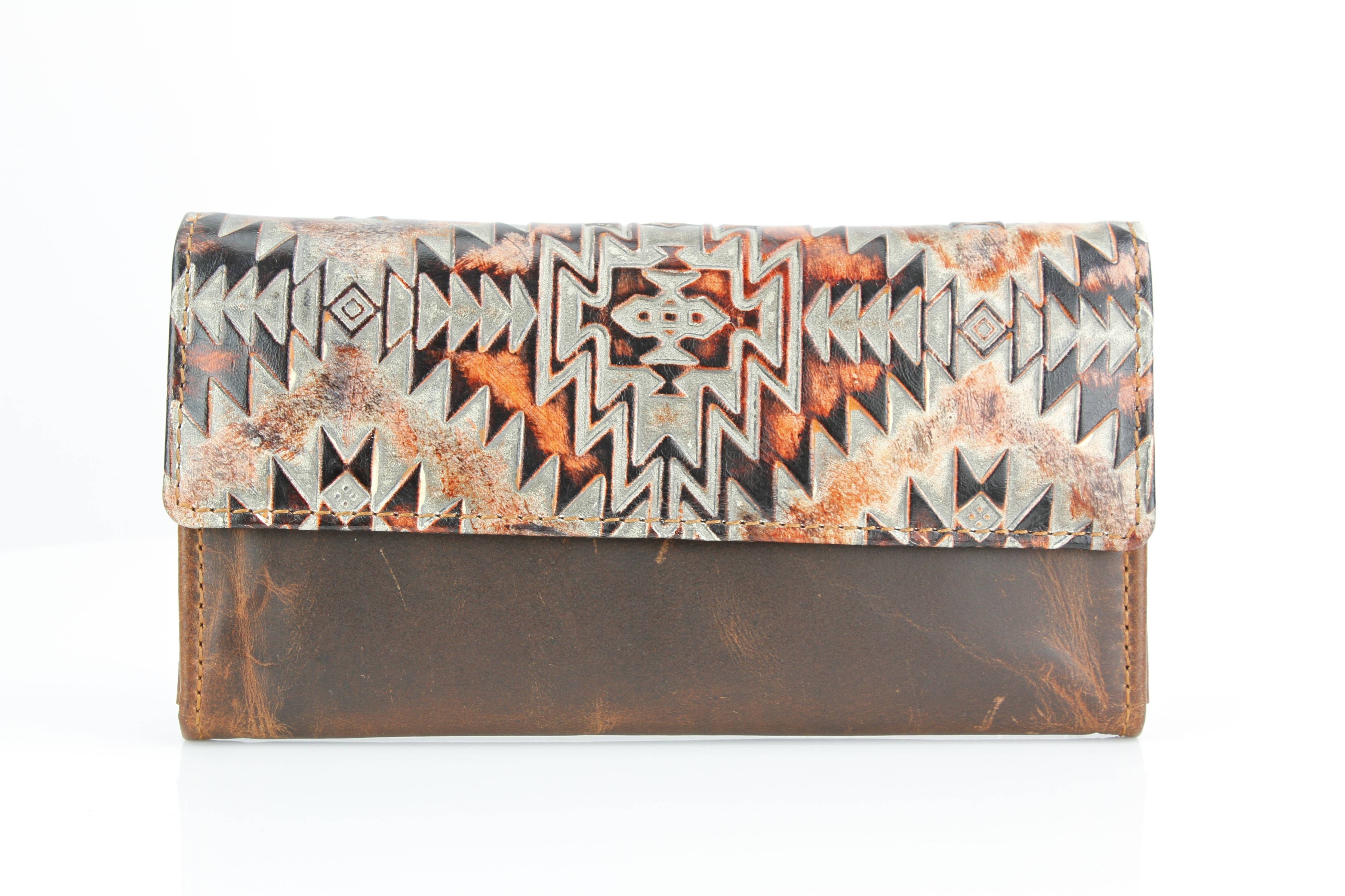 This women’s clutch wallet features a warm Aztec-inspired geometric design in shades of brown, orange, gray, and copper on the...