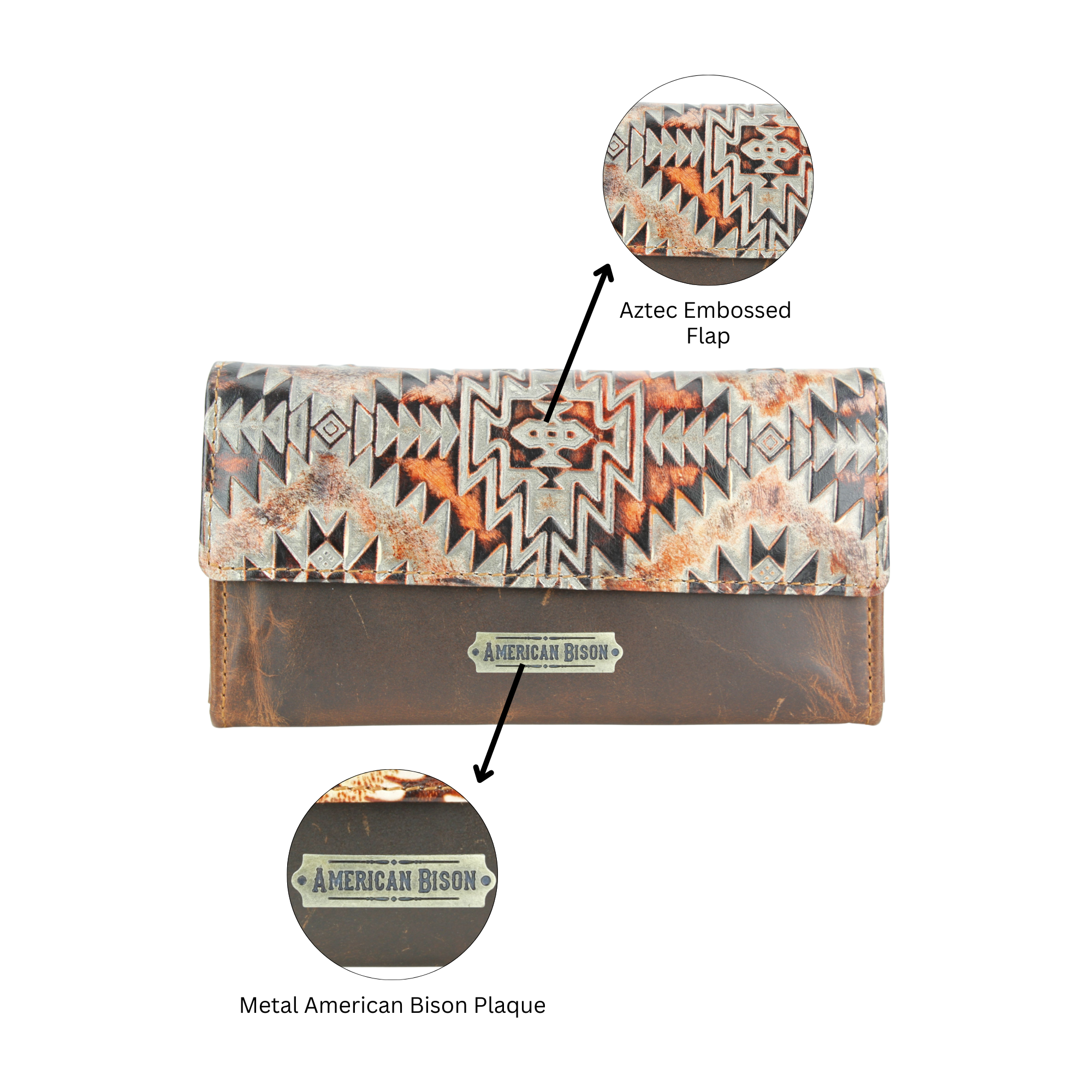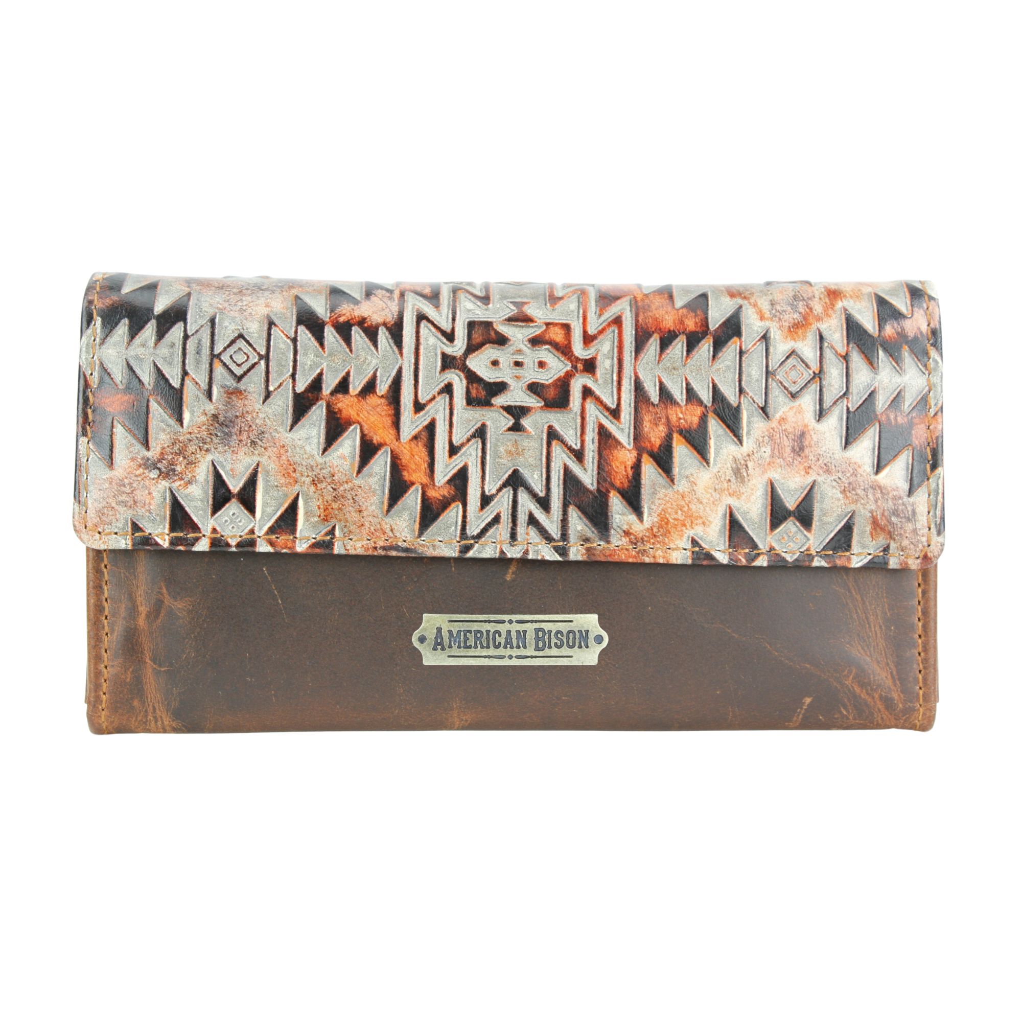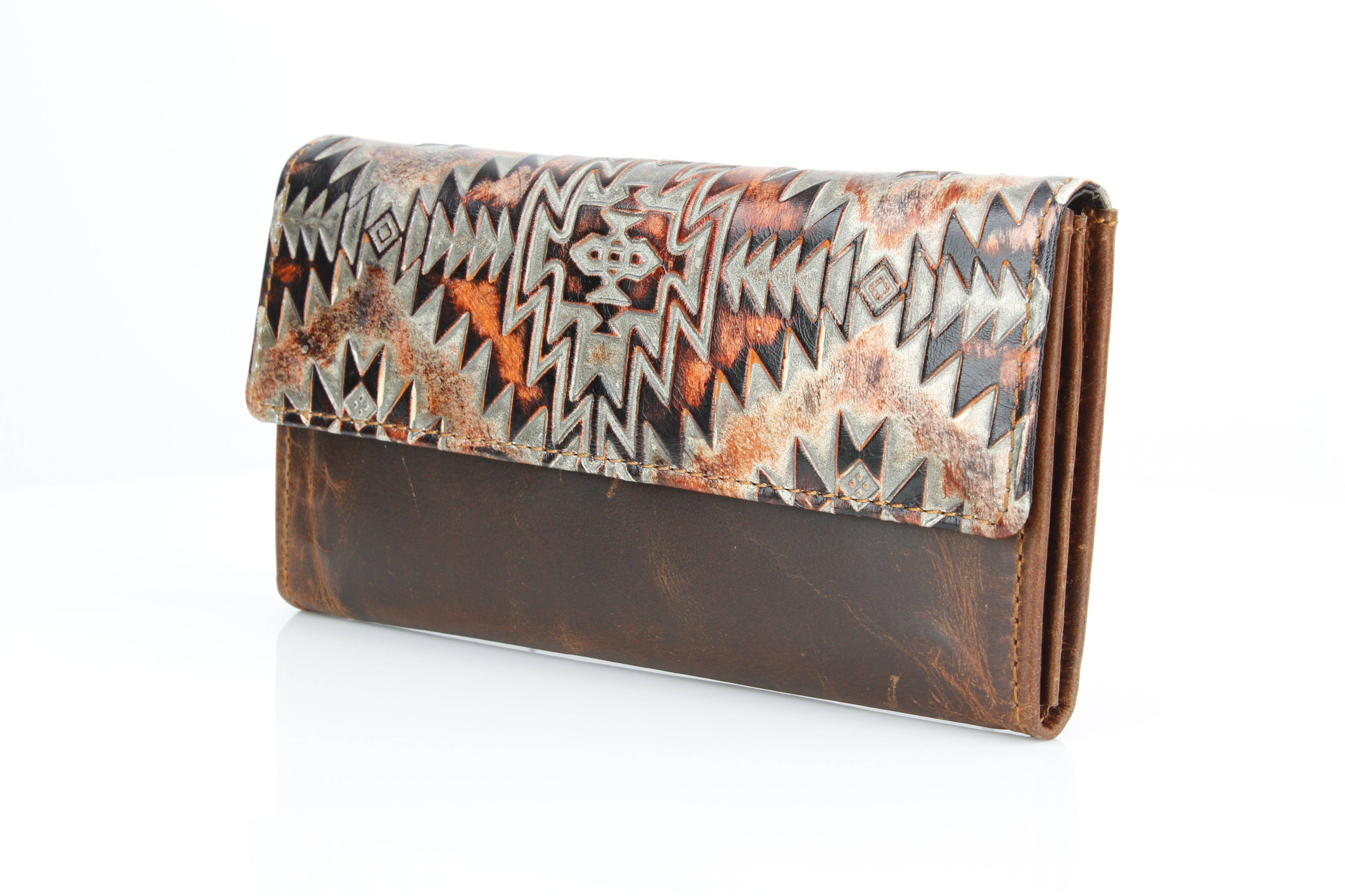This women’s clutch wallet features a warm Aztec-inspired geometric design in shades of brown, orange, gray, and copper on the...